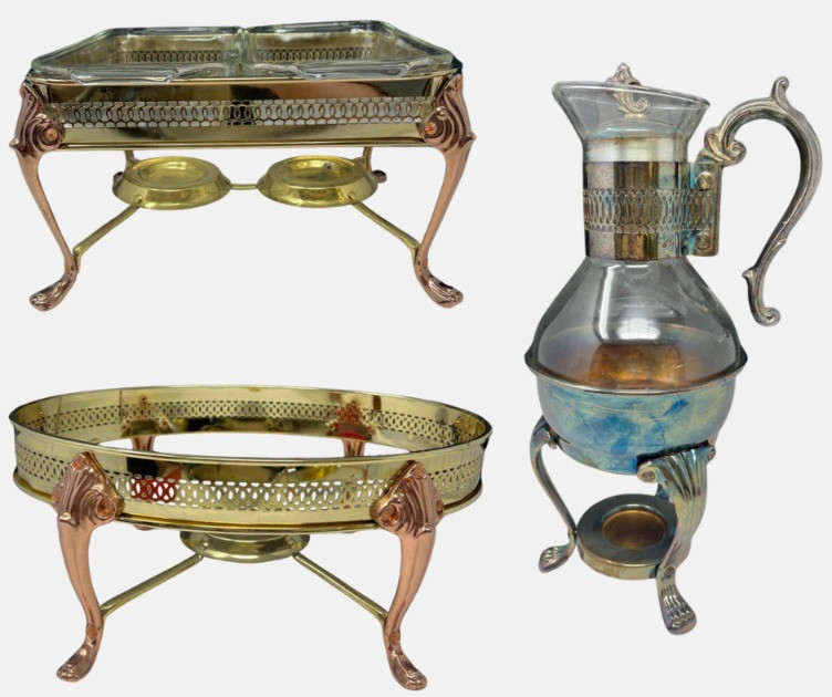 Silver carafe pot marked F.B. Rogers is 13.5” tall x 6” round Gold and copper toned oval server is 14” length x 10” width x 6" height Rectangular double compartment gold and copper toned service is 11.5" width x 10" depth x 6" height. One of the glass serving dishes has a chip (see picture).