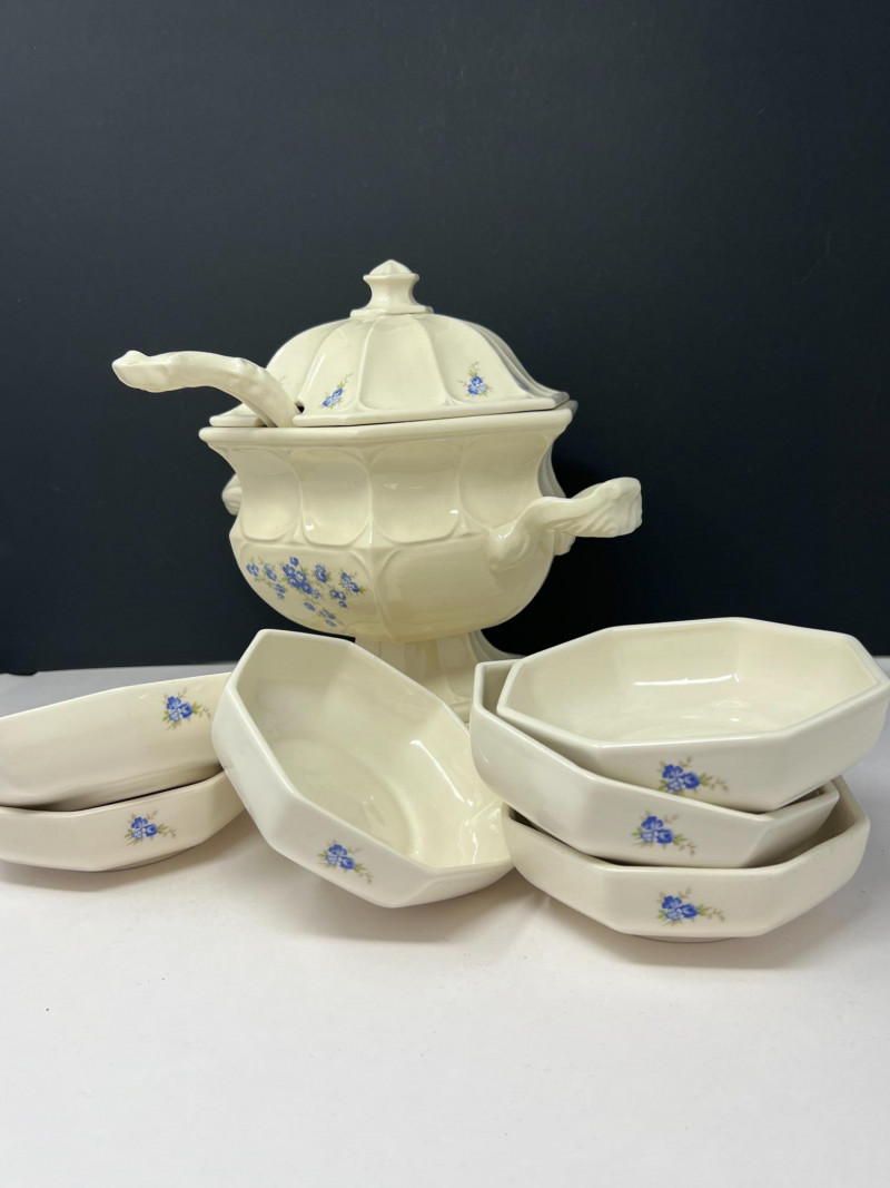 This ceramic Arnels Mold from 1961 is cream-colored with blue floral patterns and accompanied by a hexagonal-shaped matching base. Tureen is 15 inches height and 12 inches wide. Six (6) matching soup bowls (5.5 inches).