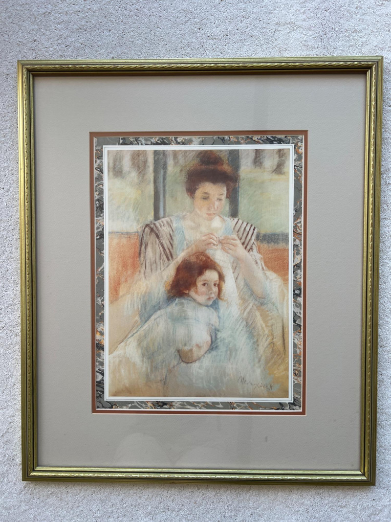 Mary Cassatt (American artist and highly celebrated) is known for her depictions of women and children. Cassatt is considered a master at conveying intimacy and emotion through her art. Wonderfully framed in gold gilt and triple matted. Print is shown as signed.
