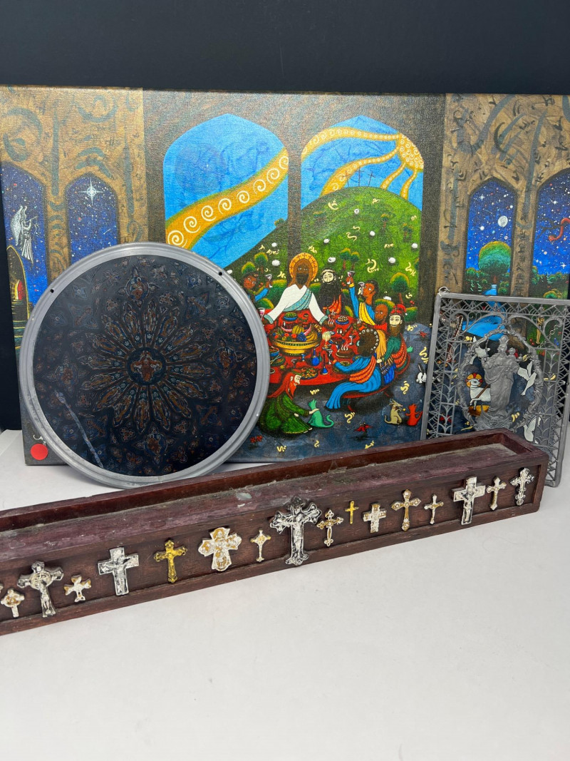Limited edition print on canvas. Numbered 51 of 150. Artist signed. Printed on canvas and coated. Depiction of the Last Supper. 24 inches x 15.75 inches. Round stained glass window hanging that celebrates the Cathedral of St. John the Divine in New York City. 10.5 inches round. Cut pewter wall hanging from Bavaria depicting a saintly figure with a child. Intricate metal work. 6 inches x 8.25 inches. Long bar votive holder with diverse crosses that convey unity in faith and design. Appears to be wood but it is likely resign. 21 inches long x 2.75" x 2.75"