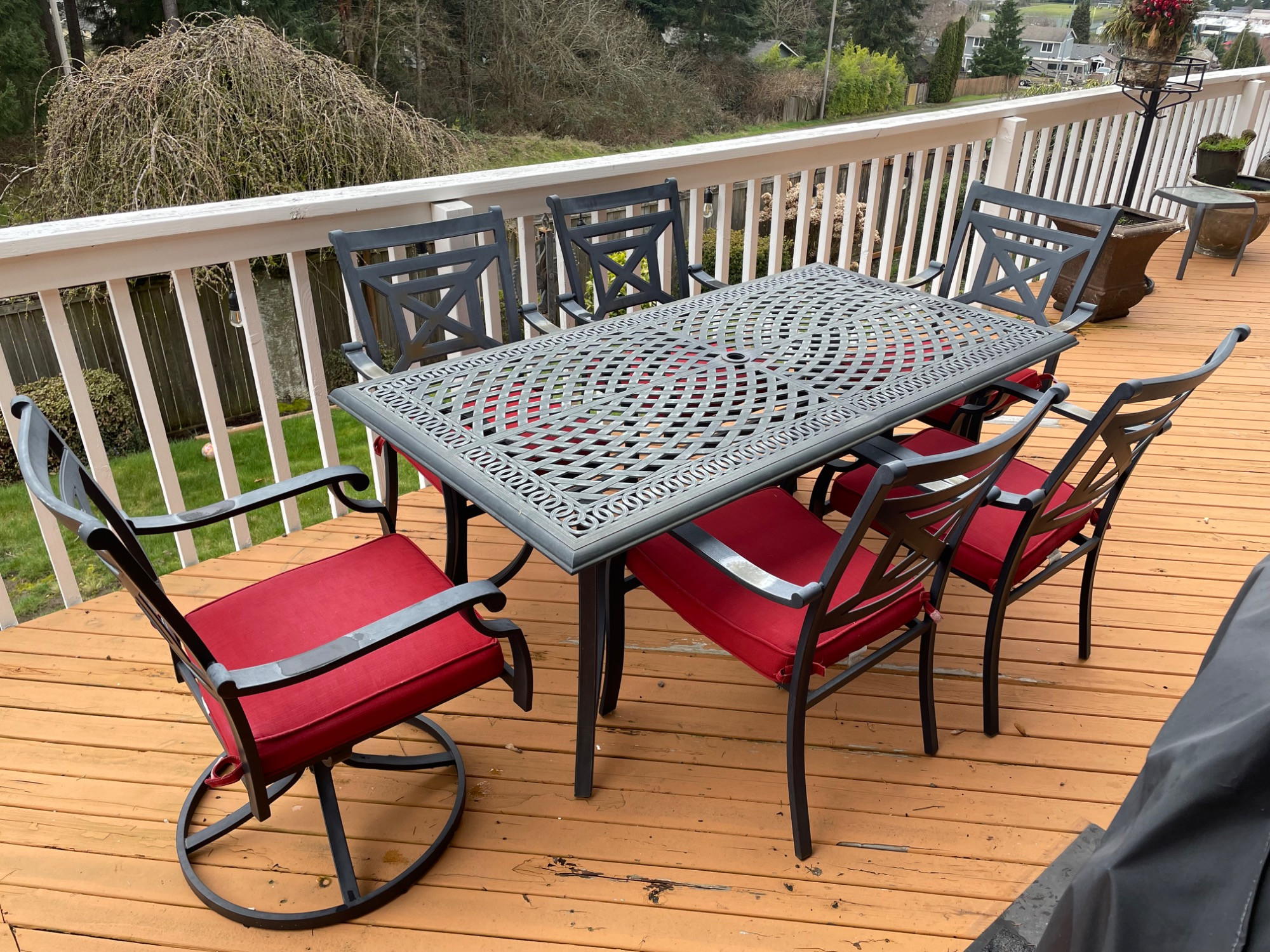 Patio Table 67" x 35" x 29" high Cushions could use some cleaning Two rocking chairs, with some minor wear on arms Four stationary chairs, with some minor wear on arms