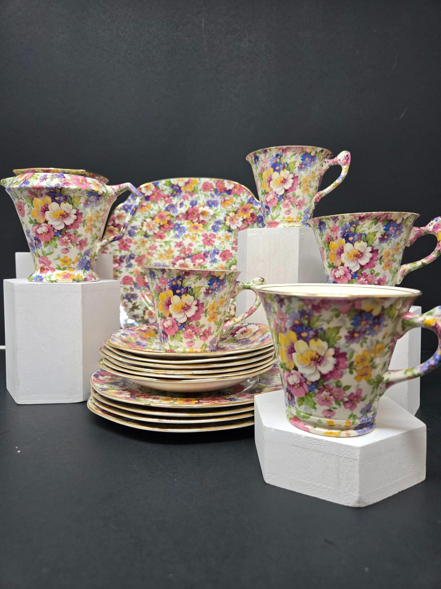 the 1930s. Made in England. Features a multi-colored floral "chintz" pattern on a white background. The interior is white, and the rim has gold trim. There's a discontinued piece, often found as part of a set with
