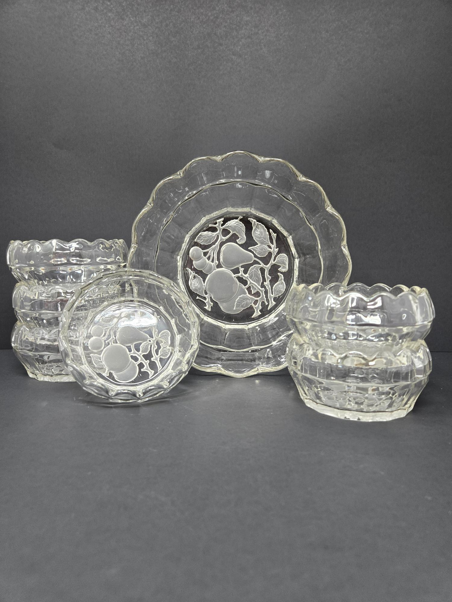 Imperial Glass Crocheted Crystal Intaglio Fruit Luncheon Bowl with 6 small serving cups. It features a fruit design, likely pears, in the