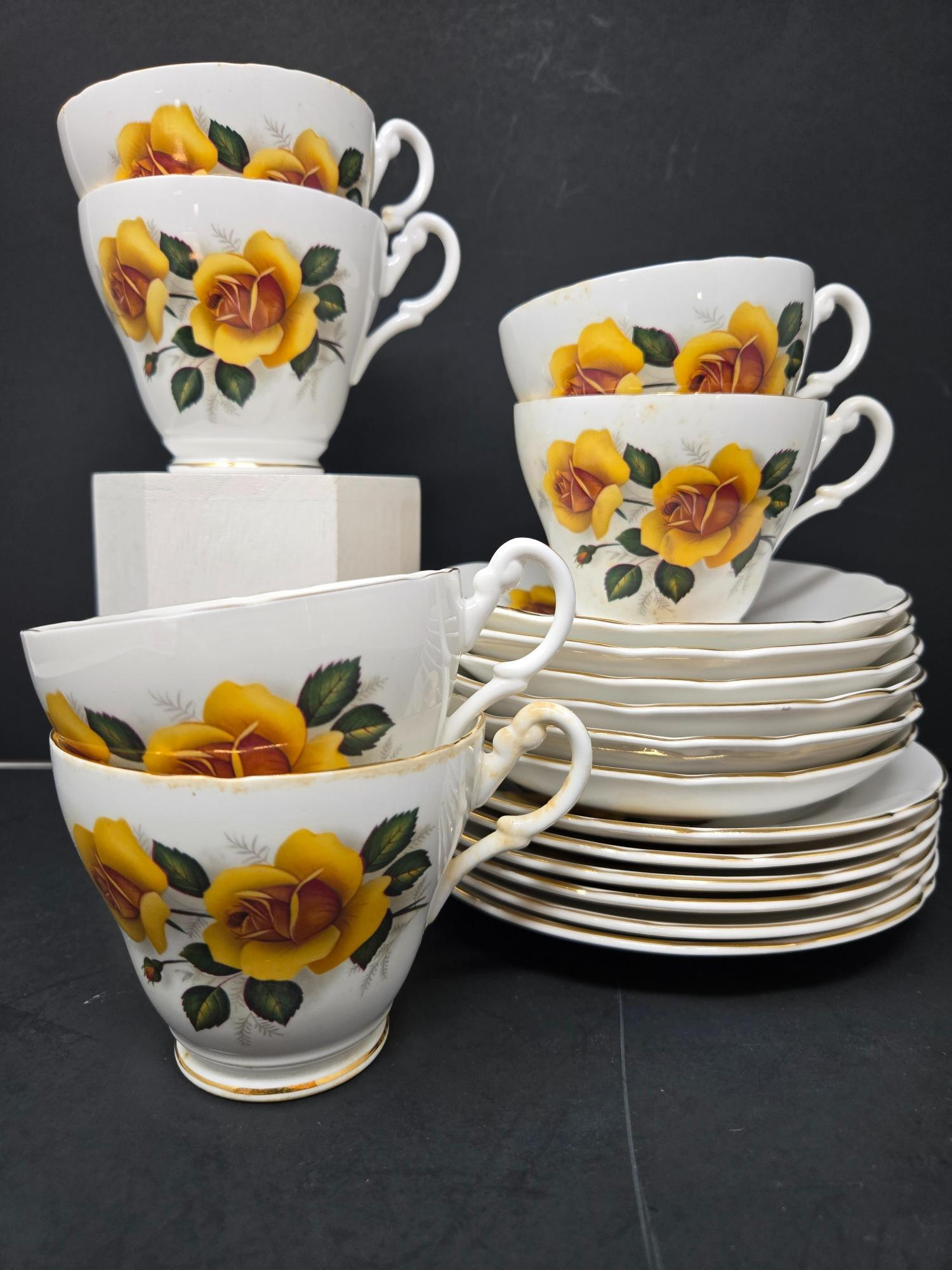 Vintage Royal Sutherland fine bone china plate, teacup trio set, made in England. Features yellow roses with green leaves and a gold trim on a