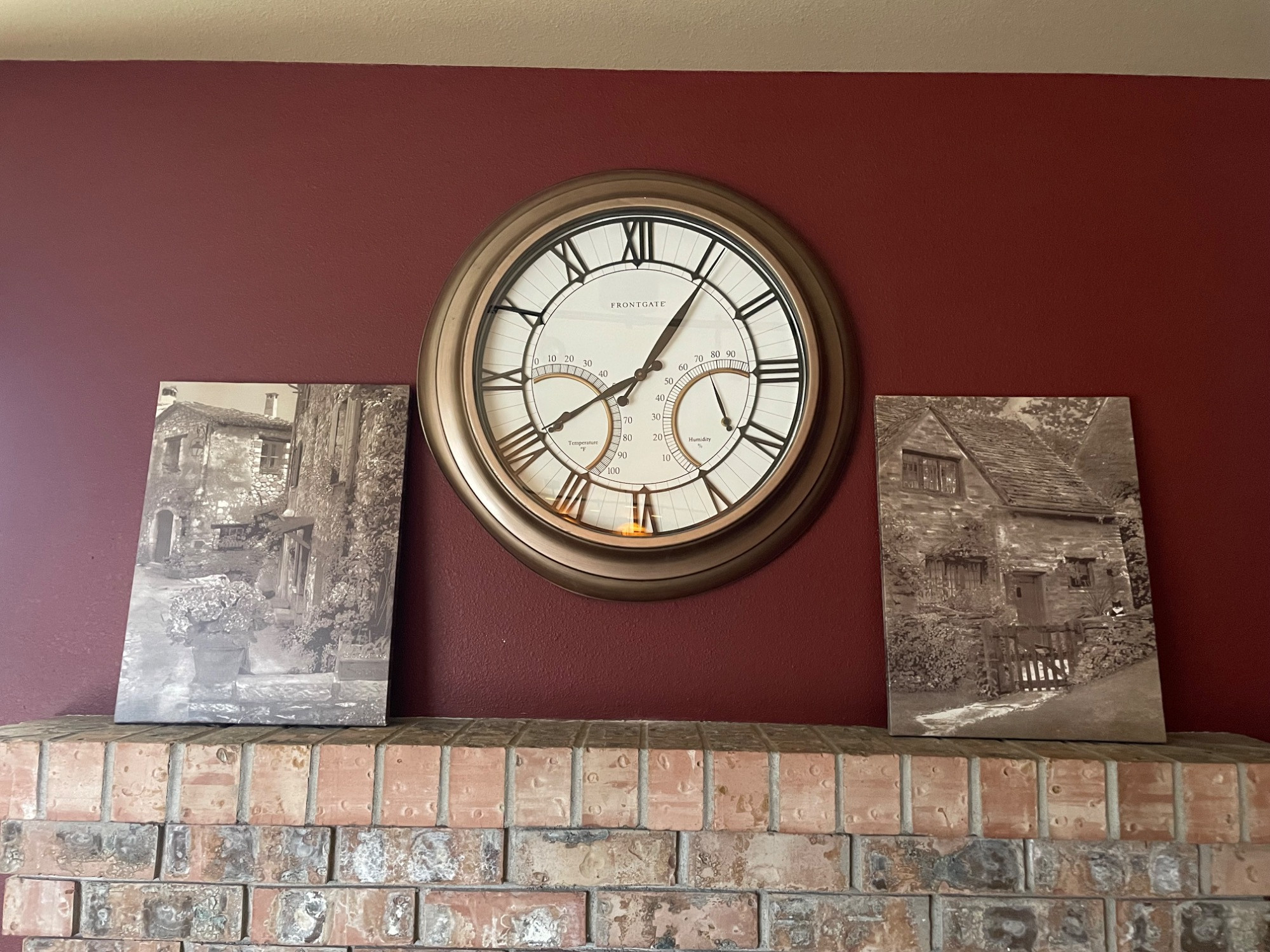 Front gate clock 27” round x 12”, has minor dent right side Pictures 18”’x 12 1/2”