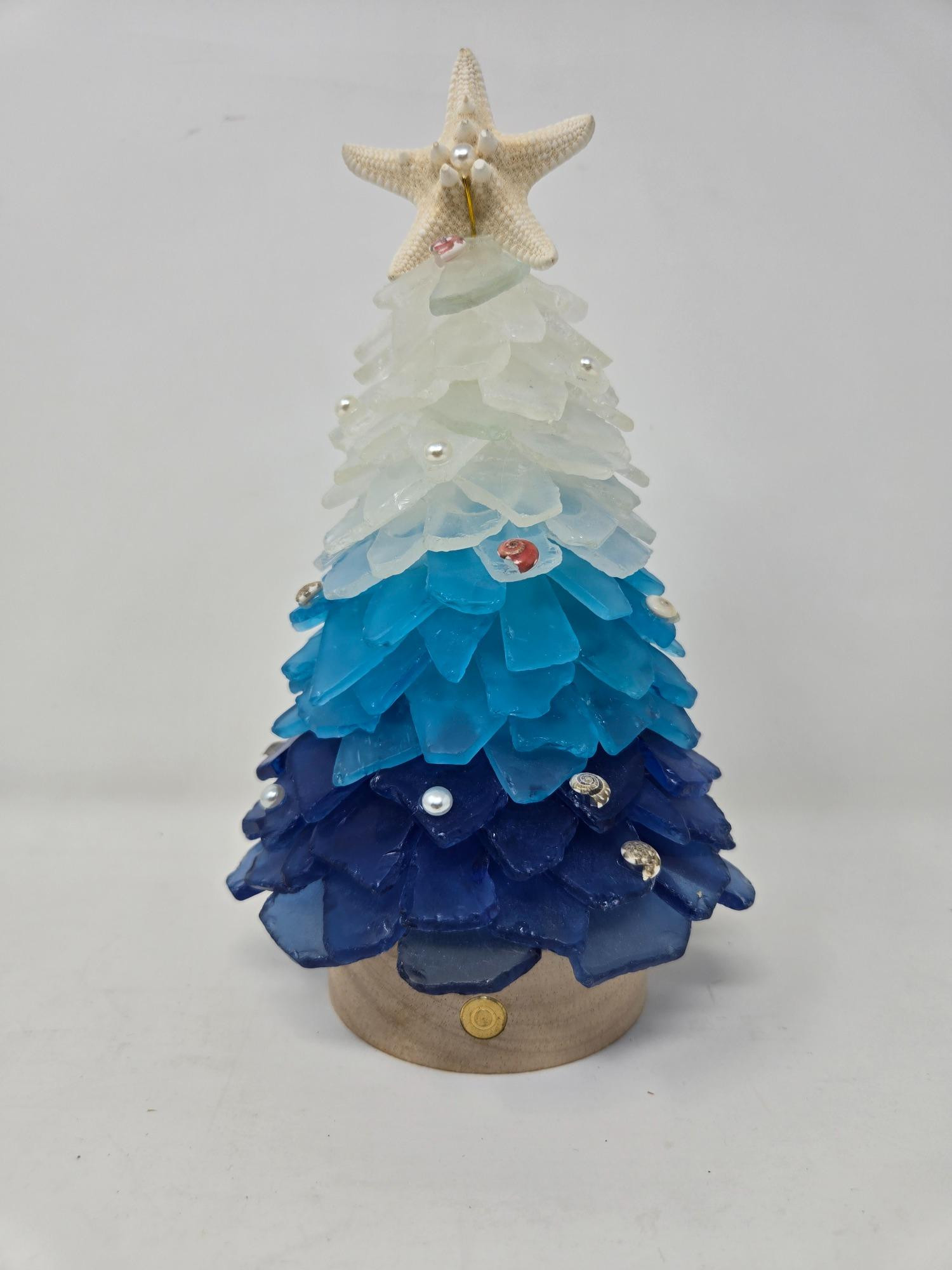Handcrafted sea glass Christmas tree Made from natural or man-made sea glass pieces. Features a gradient of blues, from light to dark, resembling