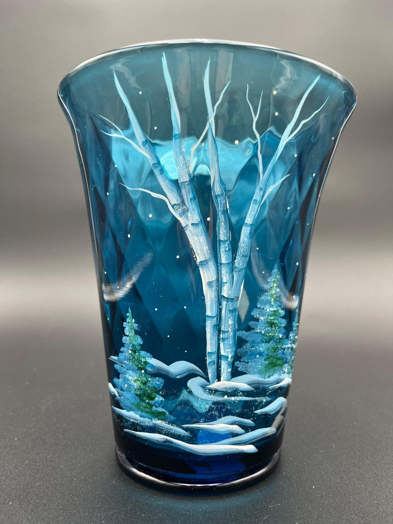 This Fenton Art Glass "Snowy Tree" vase, beautifully hand-painted with a serene winter landscape. The deep blue glass serves as the perfect backdrop for the snow-kissed birch trees and sparkling evergreen pines, creating a truly magical scene. Each detail is carefully crafted by the artist, D. Robinson, whose signature is elegantly etched on the bottom. Features: Authentic Fenton Art Glass