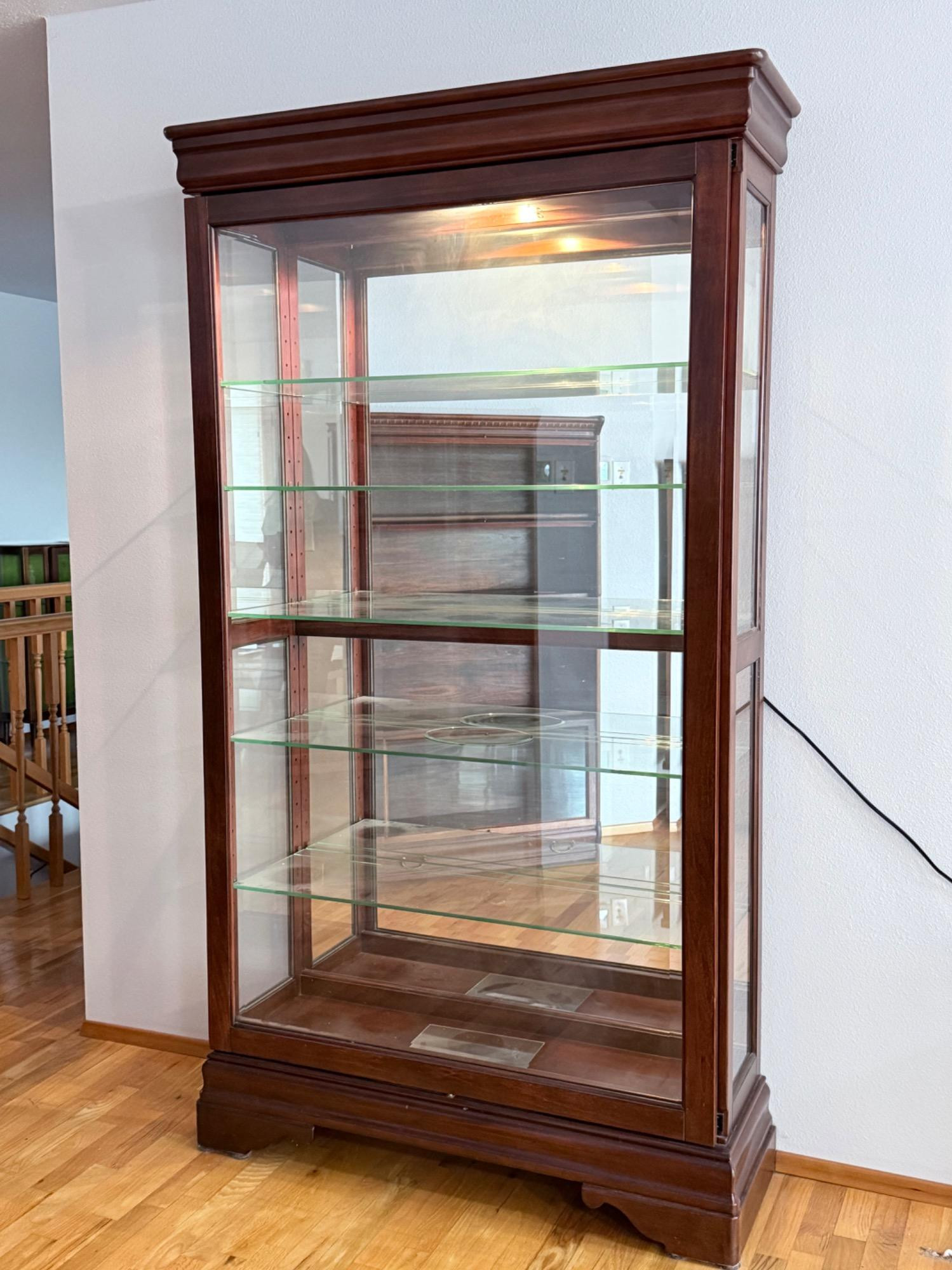 Elegant Lighted Glass Display Hutch with Adjustable Shelves This stunning glass display hutch is both functional and beautifully crafted, perfect for showcasing collectibles, glassware, or decorative pieces. Featuring a rich wood finish and sleek glass panels on the front and sides, it provides full visibility and an upscale presentation. Dimensions: 78.5" H x 41" W x 12.5" D Features: 5 adjustable glass shelves Lighting: Interior lights at the top to highlight your display Doors: Smooth sliding glass doors for easy access, slides to left and right Condition: well-maintained, some surface scratches Brand not marked, but the build and finish suggest high-quality craftsmanship suitable for both modern and traditional interiors.