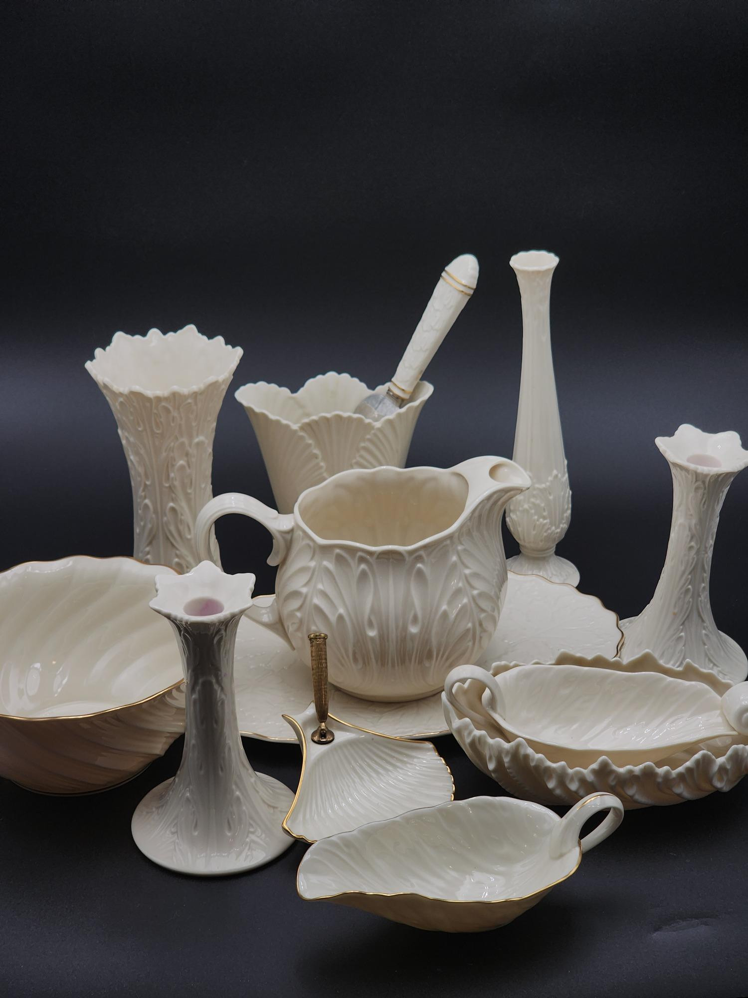 This Vintage LENOX Cottage Cabbage Leaf collection is a beautiful representation of luxury with the time and details they put on each piece. The Cottage Cabbage design is timeless with it art nouveau stylistic characteristics. It's a 13 piece set that will add to continuing collection of Lenox Christmas line. No cracks or chips found on the pieces. Dimensions: The Lenox pieces range from 14"in in Length & 8"in Tall.