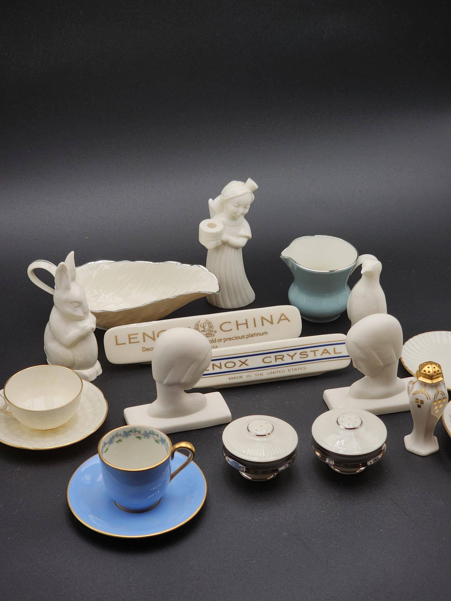 Lenox Fine China & Collectibles - Assorted Lot This charming Lenox collection includes a variety of elegant and timeless porcelain pieces, perfect for collectors or those seeking classic home décor accents. The lot features: Two white bisque porcelain bust figurines on pedestal bases A delicate porcelain figurine of a girl holding a goose Two vintage animal figurines: a rabbit and a bird A pastel blue pitcher with scalloped rim A leaf-shaped serving dish with handle Two gold-rimmed ivory teacups with matching saucers One vibrant blue teacup with gold detailing and matching saucer Two covered trinket dishes in ivory and gold A miniature white and gold urn-style vase A pair of collectible Lenox signage plaques: “Lenox China” and “Lenox Crystal” All pieces display the signature Lenox craftsmanship with fine detailing, soft ivory tones, and gold accents. Dimensions: These Lenox pieces range from 2" - 7" tall