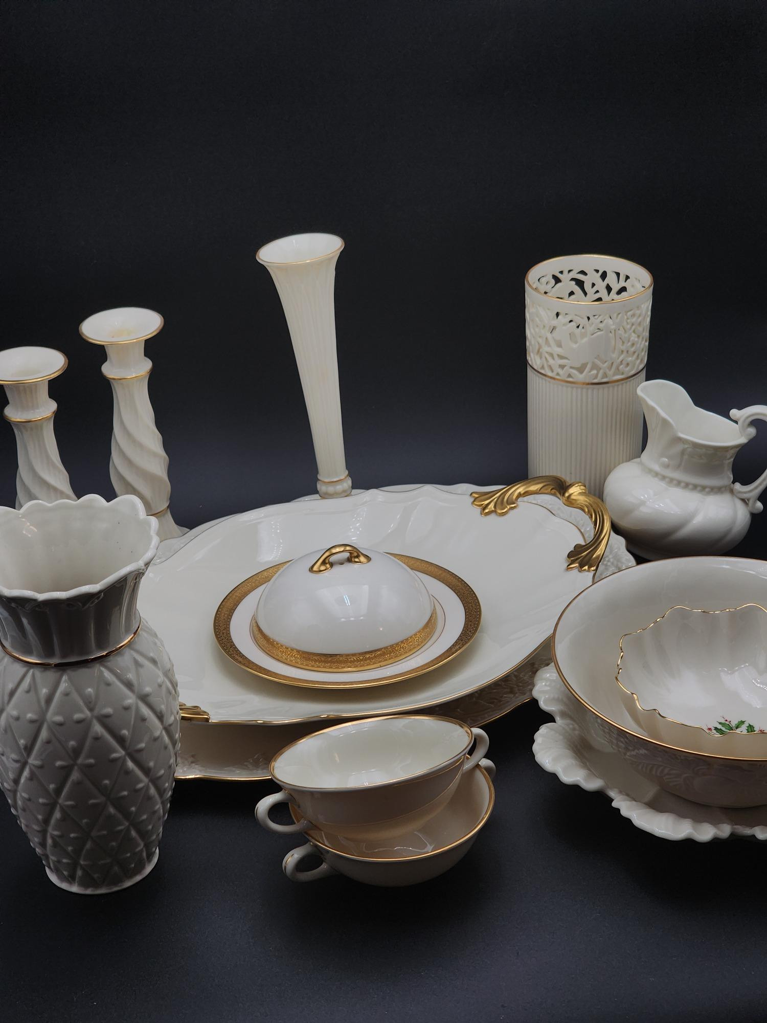 Elegant Lenox Ivory & Gold Porcelain Collection – 12-Piece Assorted Lot This exquisite collection features a variety of vintage Lenox ivory porcelain pieces, all adorned with classic gold trim, embossed detailing, and elegant sculptural form. A timeless addition for collectors or for enhancing formal table settings and displays. Included in the lot: Large oval serving platter with dome lid – Approx. 22” wide, trimmed with ornate gold handles and border Lidded tureen or covered dish – Matching the serving platter in style Pair of Lenox double-handled cream soup cups – Approx. 7" wide, with delicate gold rims Large scalloped fruit or centerpiece bowl – With embossed fruit garland design and pedestal base Pitcher with embossed swirl and beaded detail – Approx. 7.5" tall, ornate scroll handle Tall fluted vase – Sleek vertical ridges, approx. 12" tall Three spiral twist taper candlestick holders – Classic ivory glaze Openwork lattice and animal motif vase or candle holder – Features elegant cut-out design with gold accent trim Scalloped shell-edge serving plate – Textured and curved edge detailing Small holly-accented bowl – Signature Lenox holiday flair with gold trim All pieces exhibit the signature Lenox ivory porcelain glaze, with gold embellishments and detailed craftsmanship. No chips or cracks observed in inspection.