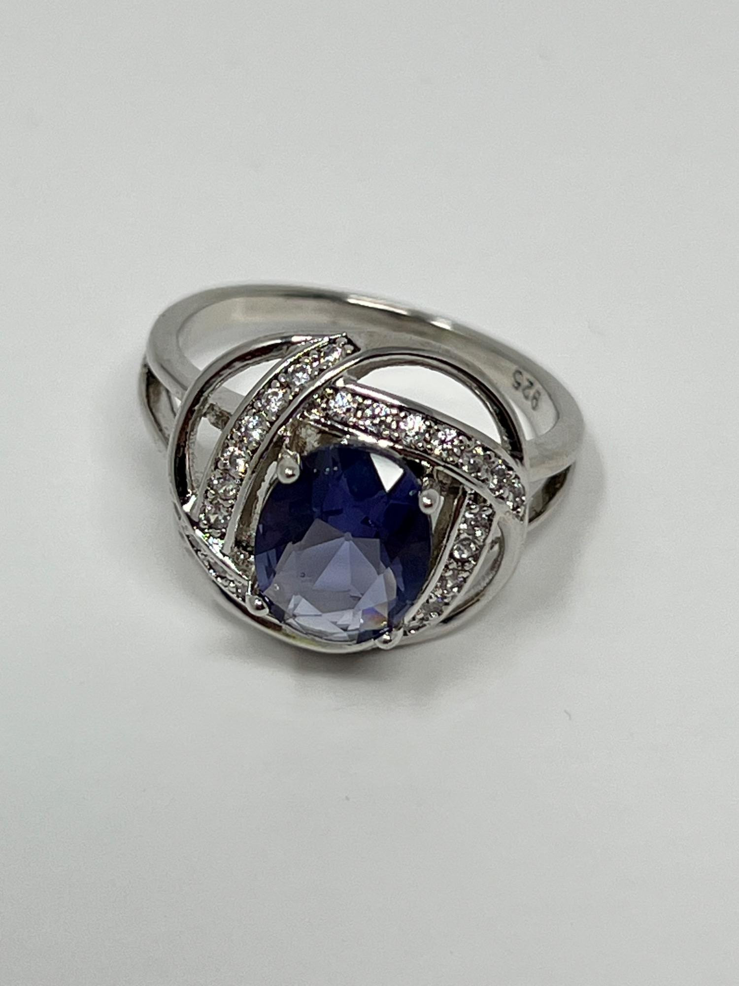 This stunning 925 sterling silver ring features a deep blue faceted oval gemstone as the centerpiece. The stone is gracefully embraced by a unique overlapping band design, encrusted with brilliant clear accent stones for extra sparkle and sophistication. Material: Solid 925 Sterling Silver Main Stone: Faceted oval-cut blue gemstone Accent Stones: Small clear round stones along the band Ring Size: US Size 9 Condition: Excellent, gently pre-owned