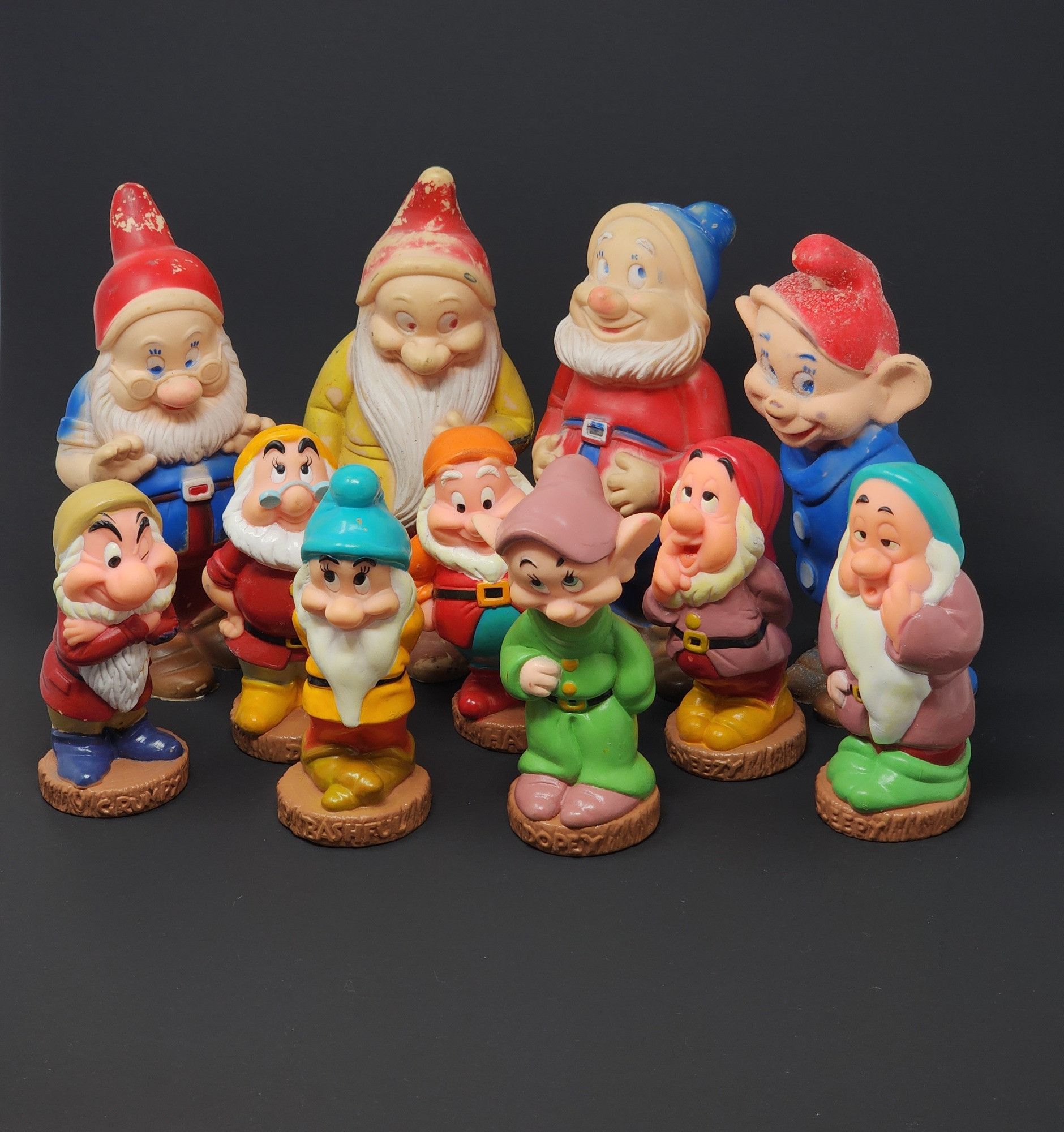 This charming and rare complete set of vintage 1950s Snow White & The Seven Dwarfs bath toys includes all seven dwarfs plus additional characters for a total of 11 unique figures. Made of soft rubber or vinyl typical of mid-century bath toys, each figure captures the classic Disney magic with vibrant colors and delightful expressions. Features: Authentic 1950s era set Includes all Seven Dwarfs + 4 additional related characters Bright, original paint with charming aging patina Overall good vintage condition, some figures show minor paint wear.