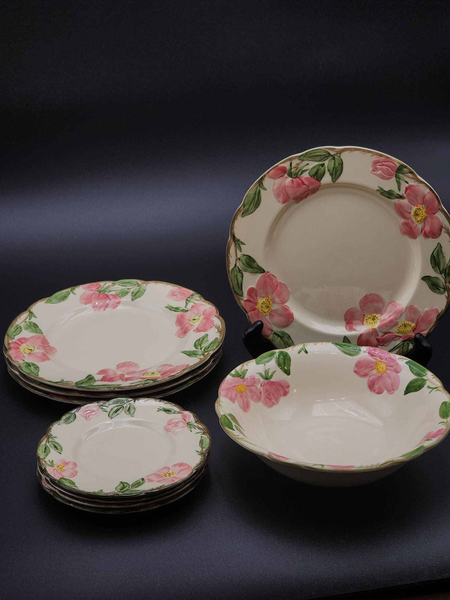 Franciscan Desert Rose Dinnerware – 9-Piece Set – Vintage USA Made This charming 9-piece Franciscan Desert Rose dinnerware set features the iconic hand-painted pink rose pattern with green leaves on a cream background. Made in the USA, this timeless pattern has been a collector favorite since its introduction in 1941. The set includes a lovely mix of small plates, larger 9" plates, and a serving bowl—perfect for vintage table settings or completing a collection. Pattern: Desert Rose Brand: Franciscan (USA Made) Set Includes: 4 small plates (bread/dessert) (4") 4 dinner plates (9") 1 round serving bowl (9" x 2" depth) Material: Earthenware/ceramic Condition: Excellent vintage condition – no chips, cracks, or crazing noted Era: Likely mid-20th century (USA backstamp)