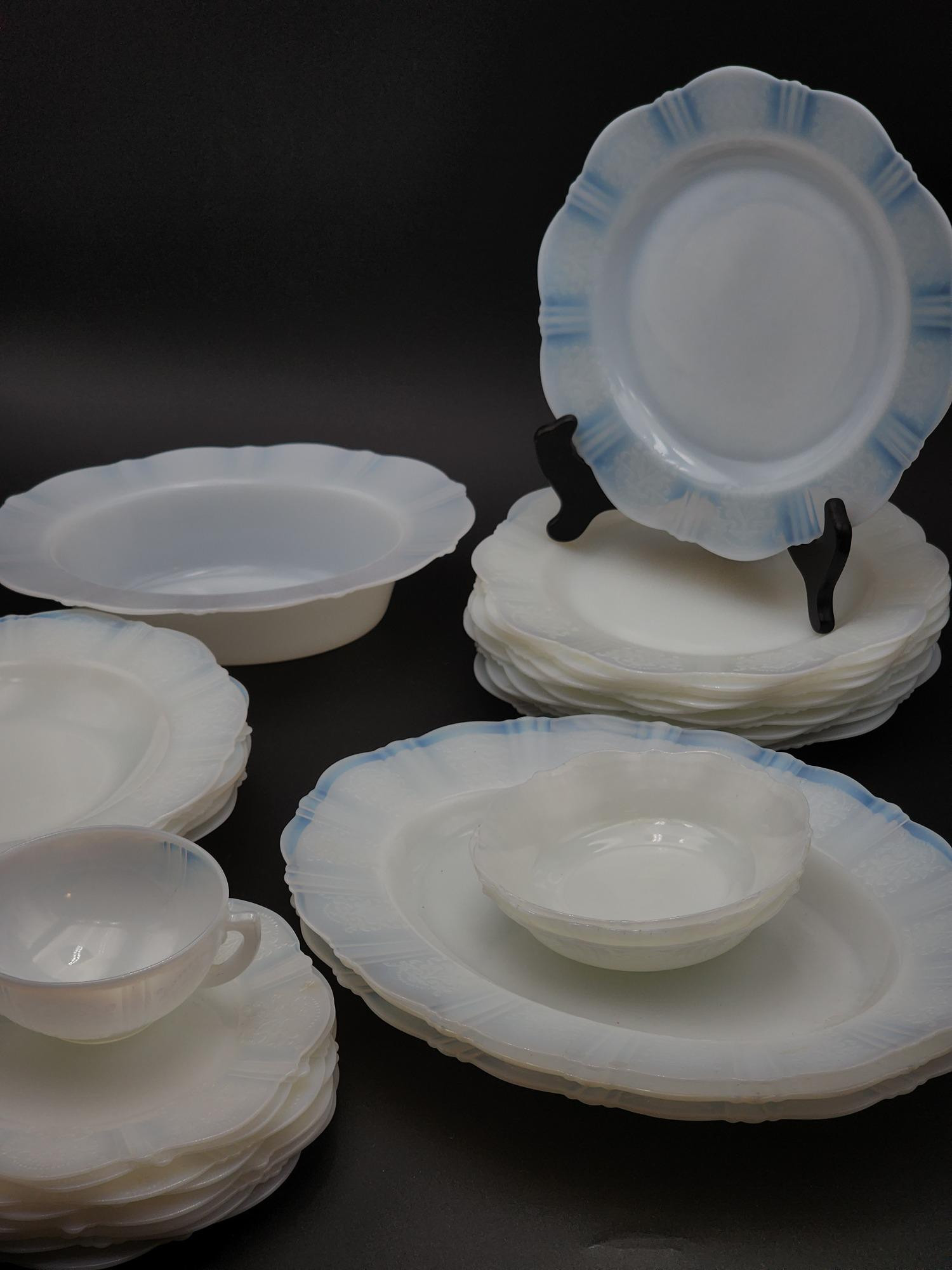 Bring timeless elegance to your table with this stunning vintage collection of Macbeth-Evans Depression Glass in the American Sweetheart pattern. This highly sought-after set features beautiful white opaque glass with delicate embossed floral details and softly scalloped edges, accented by hints of soft blue. Produced in the 1930s, this Depression Glass collection combines charm and durability, perfect for collectors or vintage tableware lovers. The pieces exhibit the graceful Art Deco styling and are known for their milky translucence and fine craftsmanship. Included in this set: Dinner Plates Salad/Dessert Plates Soup/Cereal Bowls Serving Bowls Platters Cups & Saucers Condition: Overall in excellent vintage condition with minimal signs of age or use.