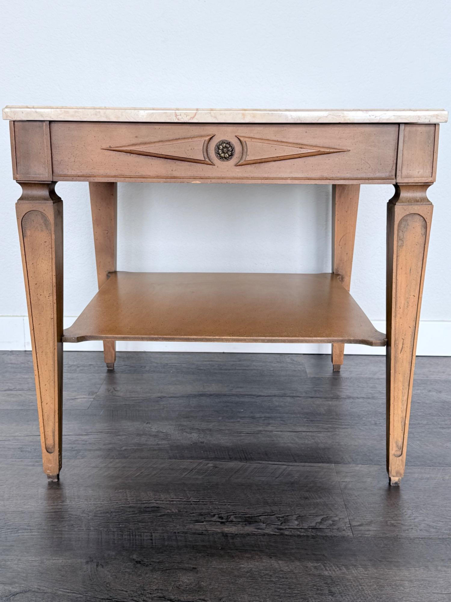 This is a vintage side table featuring a genuine beige marble top with natural veining and fossil-like patterns. The table is constructed from wood with a warm, lightly distressed finish. Details: Beige marble top with natural fossil inclusions Single drawer with carved geometric detailing and a round floral knob Tapered legs with fluted accents and recessed panels Lower shelf for additional storage or display Mid-century style, possibly Hollywood Regency or Art Deco influence 24.5" x 24.5" x 23.5" Height Condition: