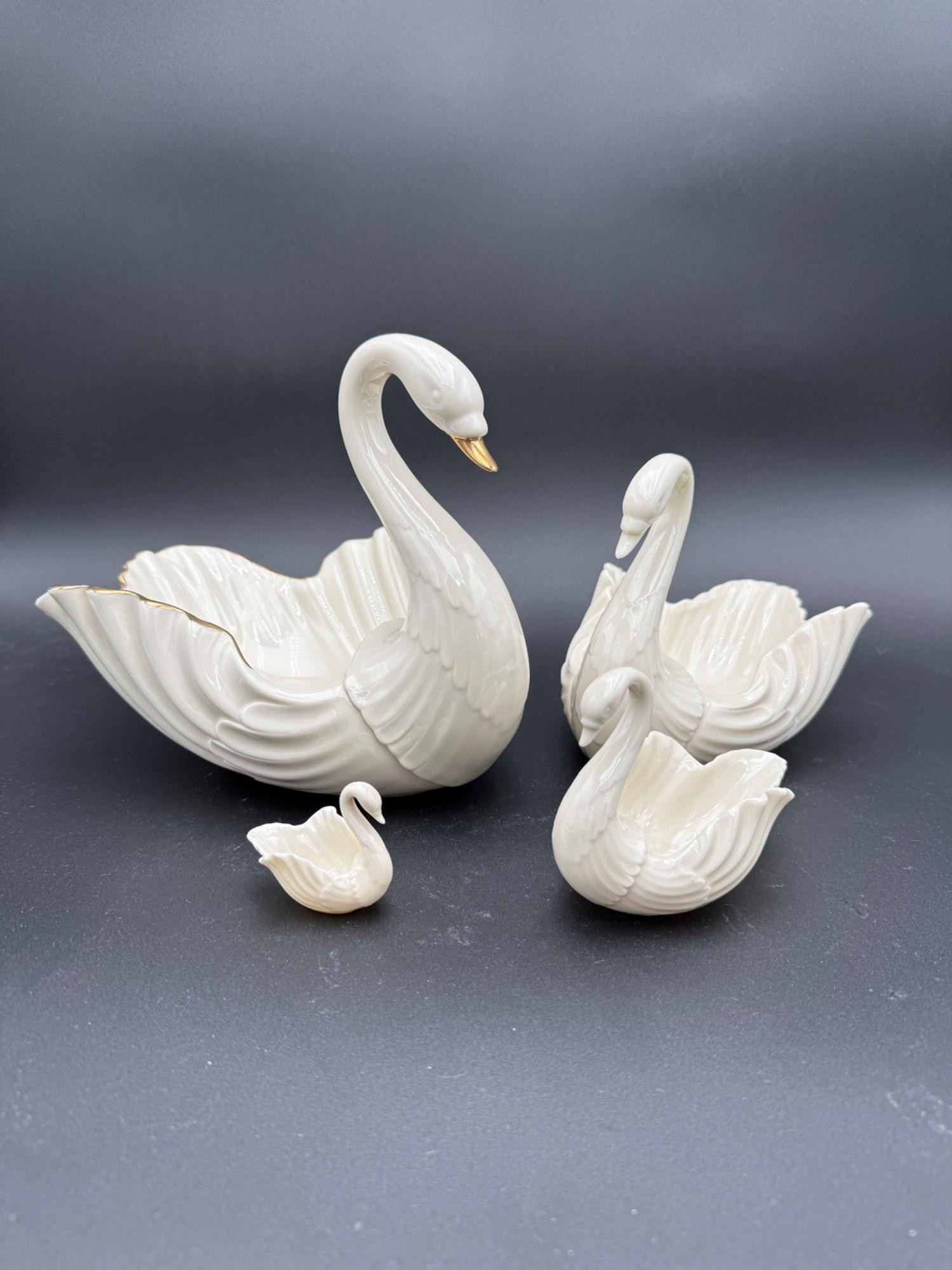 This graceful 4-piece set of Lenox porcelain swans is made in the USA. Each swan features a creamy ivory glaze with subtle gold accents and the classic Lenox backstamp. Set includes 4 swans in varying sizes: Smallest: approx. 2" tall Largest: approx. 8.5" tall x 11" wide Sculpted with detailed feathers and flowing lines Suitable as planters, centerpieces, or decorative pieces One swan from the Lenox Millennium Collection™ All pieces marked with the Lenox Laurel "L" logo