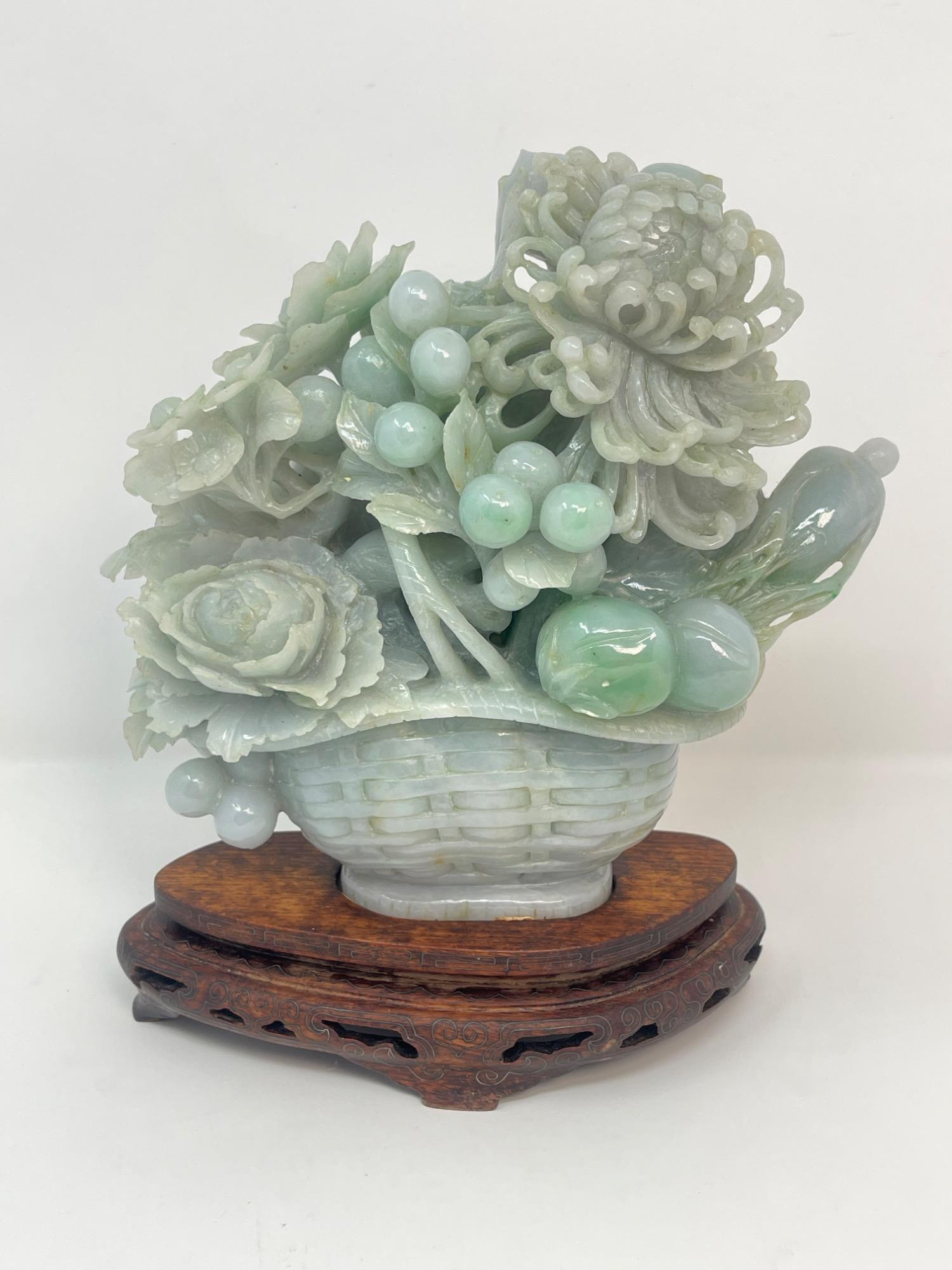 Hand-carved jadeite sculpture featuring a floral arrangement in a woven-style basket. The piece showcases delicate blossoms, fruit, and foliage in soft green and white tones, all intricately detailed. It rests on an ornate carved wooden stand. Appraised in 2001 with an estimated value between $3,600 and $4,500 dollars. Believed to have originated from 19th century China. Condition: Minor staining present, visible in photos. No noted chips or cracks.