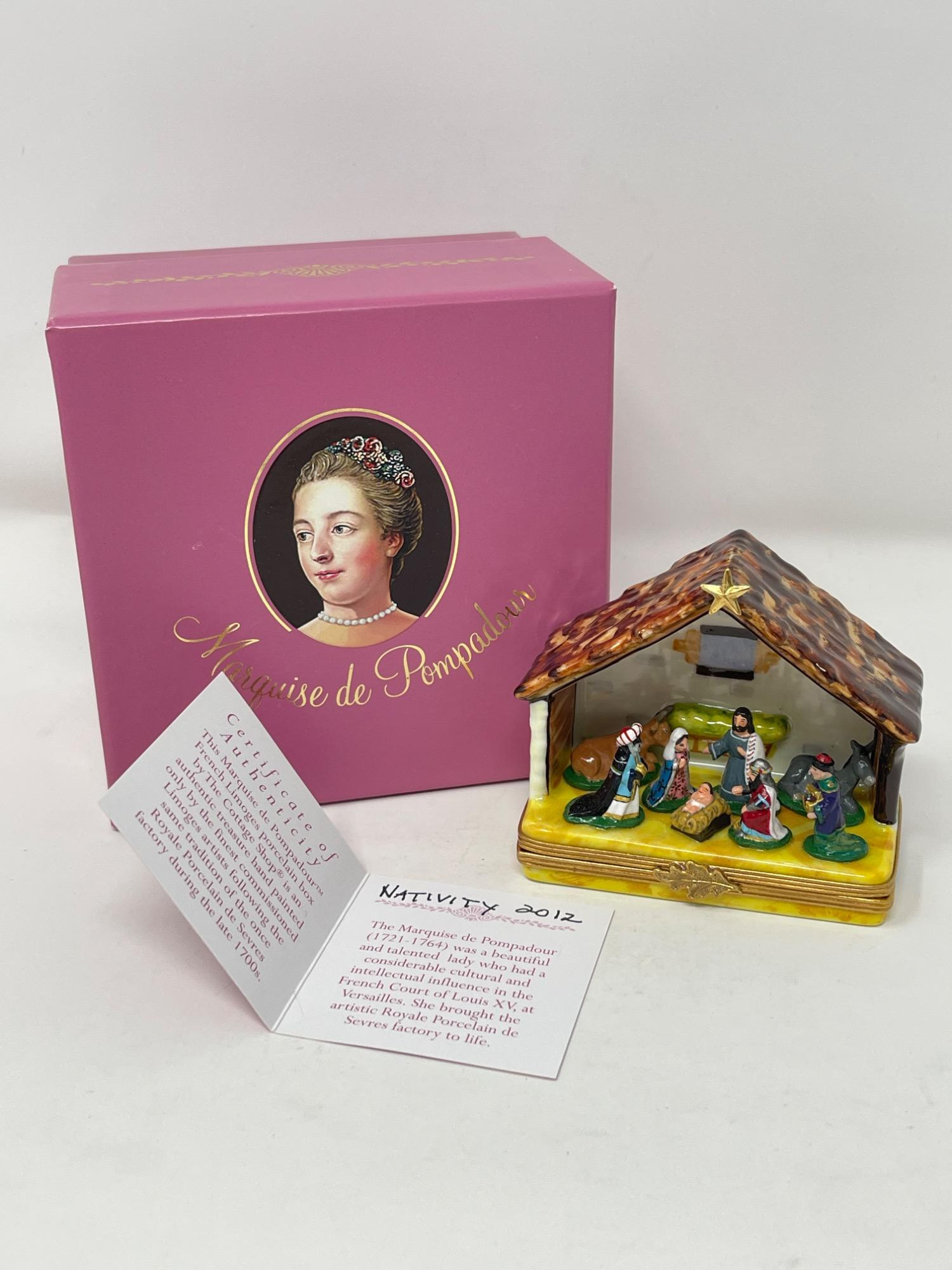 Hand-painted porcelain nativity trinket box by Marquise de Pompadour, made in Limoges, France. Features a detailed nativity scene inside a hinged stable-form box with a gold star on the roof. Includes original box and certificate of authenticity. Dated 2012.
