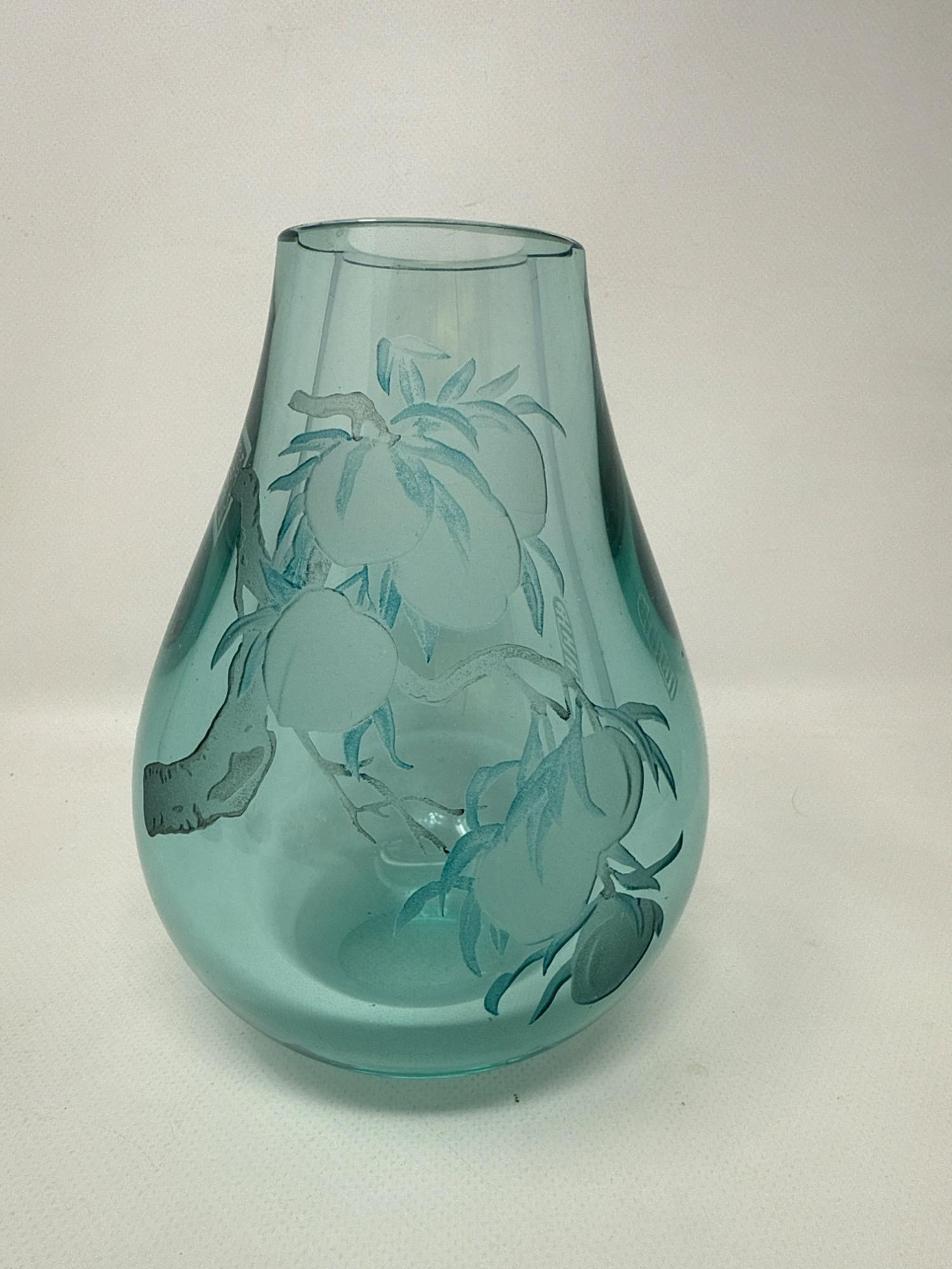 Graceful teardrop-shaped vase in a translucent teal hue, featuring an etched design of ripened peaches and leaves. The satin-like etching contrasts beautifully with the smooth glass surface, offering a subtle decorative touch. Condition: Excellent. Minor surface scratches from use, but no observed chips.