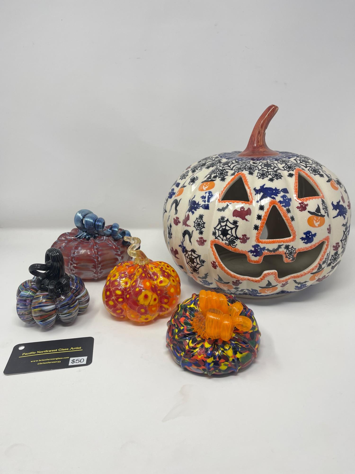 Collection of five decorative pumpkins, including four handblown art glass pieces and one ceramic jack-o’-lantern. The ceramic pumpkin features a Halloween-themed cutout design and is the tallest of the group. The orange, red, and yellow pumpkin is from Uno Alla Volta. The black-stemmed multicolor pumpkin is by Pacific Northwest glass artist Brian Farmer. A vibrant and festive autumn display set.