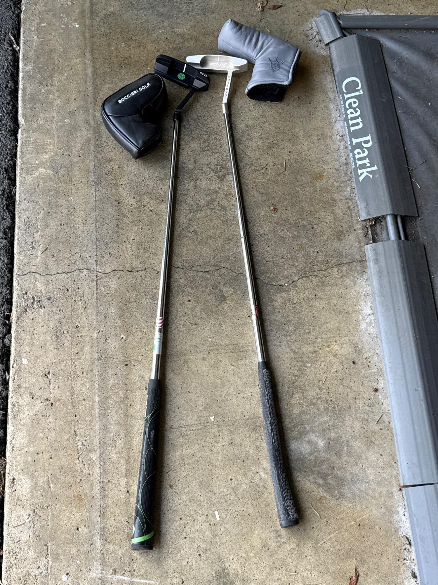 Premium golf putter set including a Scotty Cameron Pro Platinum putter and a Boccieri Golf Heavy Putter, both with headcovers. These high-quality putters are known for their superior balance, control, and performance on the green.