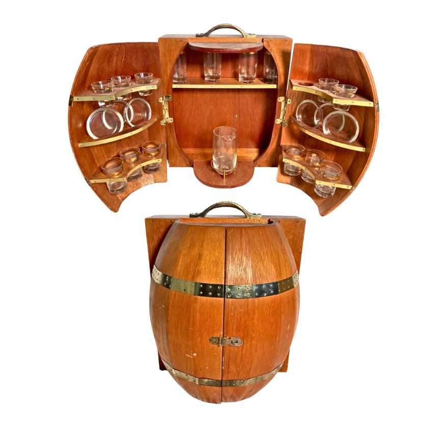 Charming barrel-shaped bar cabinet with brass accents, designed to open and reveal a full set of mid-century glassware. Includes shot glasses, tumblers, and a tall mixing glass, all neatly fitted into designated compartments. A unique conversation piece that combines functionality with nostalgic style.