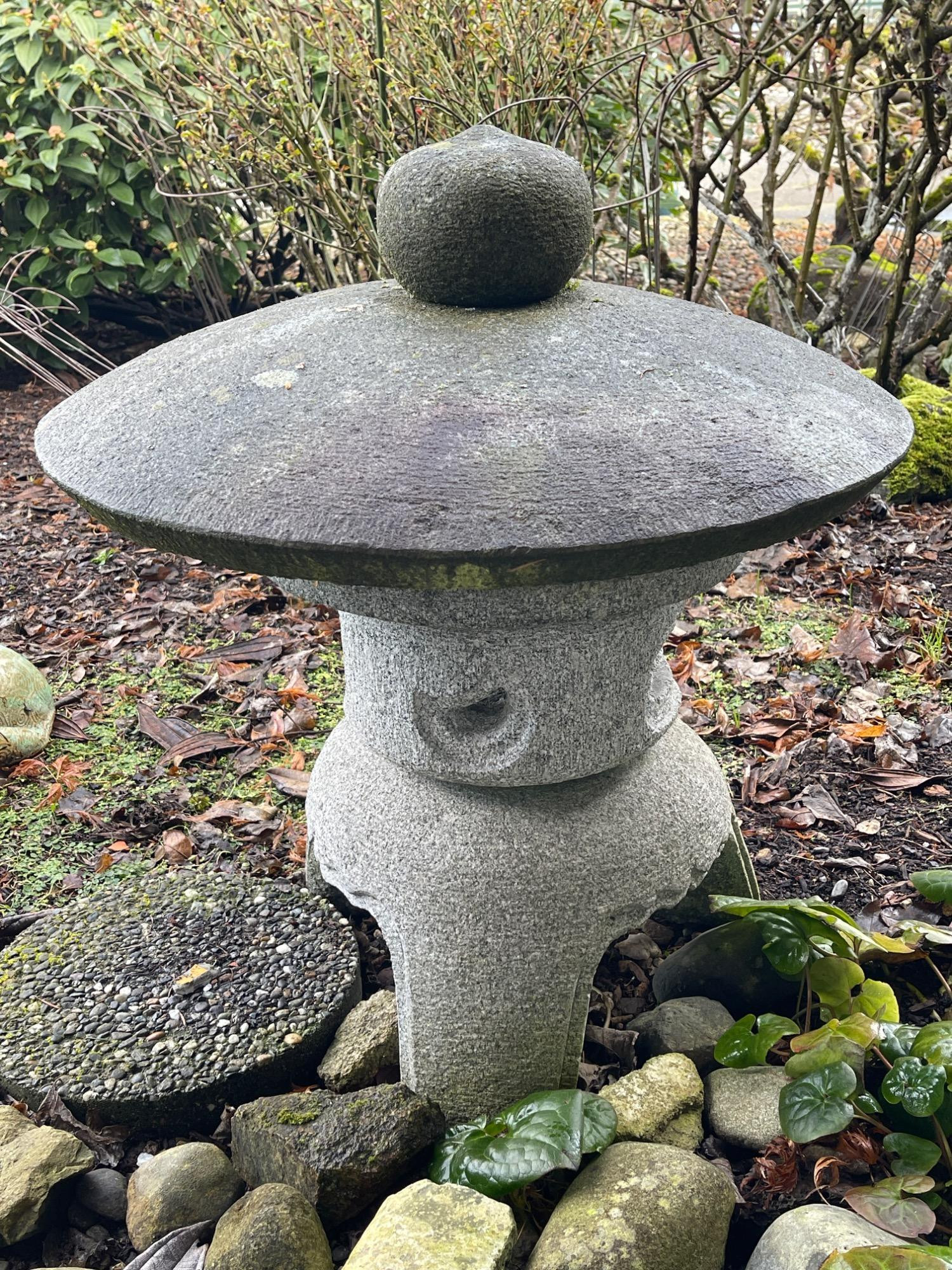 Substantial stone garden pagoda featuring classic architectural lines and traditional form. This three-piece structure adds a serene, sculptural presence to any outdoor space, inspired by Japanese lantern designs. Measurements: Approx. 26" H x 26" W Condition: Weathered surface consistent with outdoor use. No major cracks or structural damage observed.
