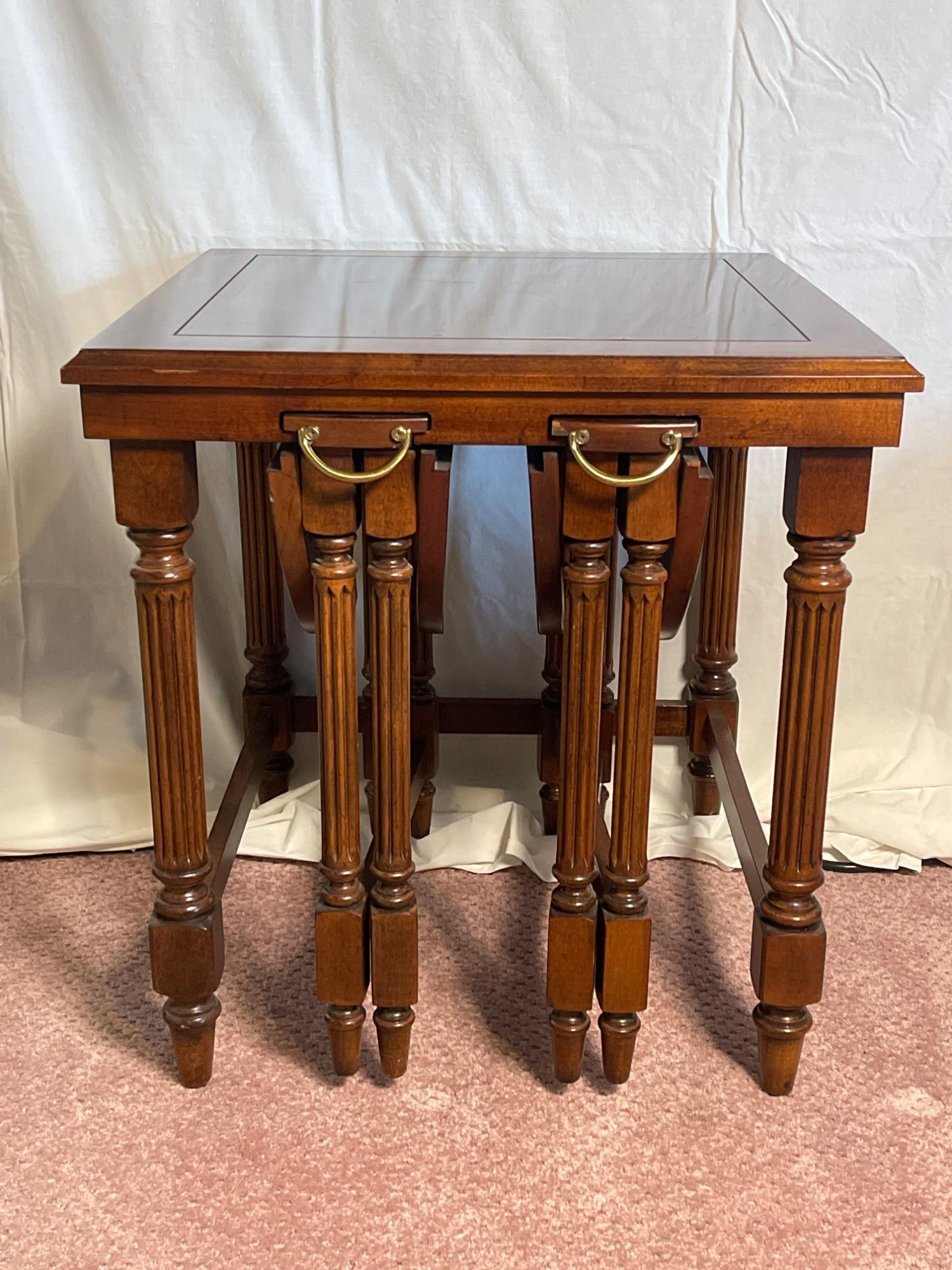 Vintage Gordon’s Solid Wood Side Table w/ Nesting Tables Vintage solid wood side table by Gordon’s Fine Furniture (Johnson City, TN) featuring a classic fluted leg design and a coordinating set of four nesting tables with brass pulls. The nesting tables store neatly underneath, combining form and function.