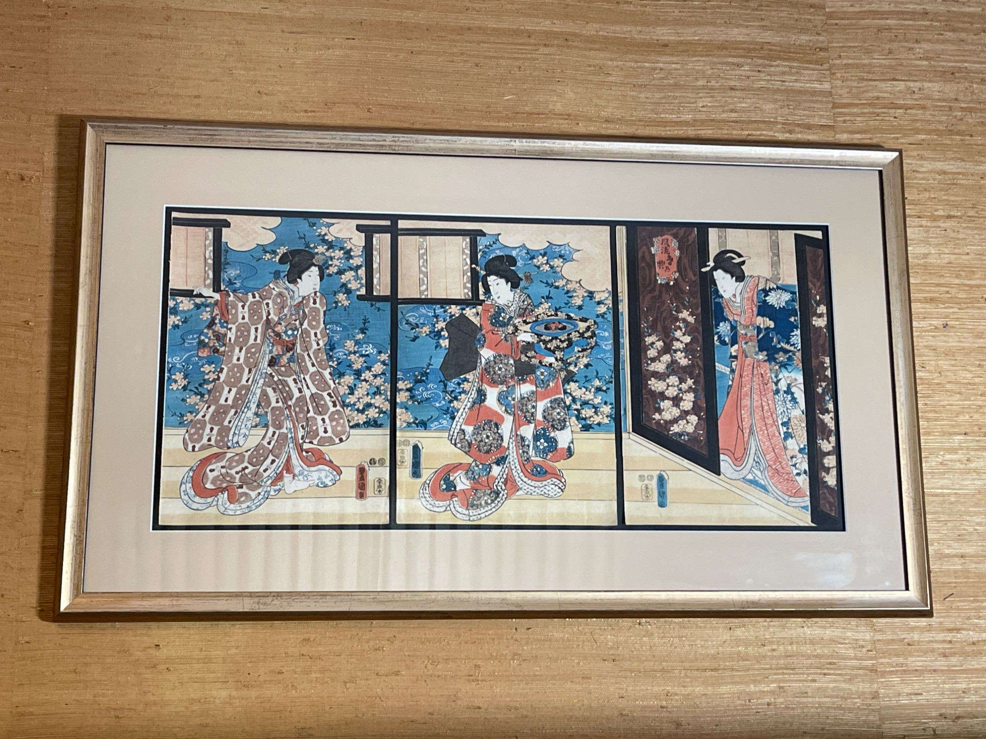 Framed Japanese Woodblock Triptych – Floral Kimono Scene