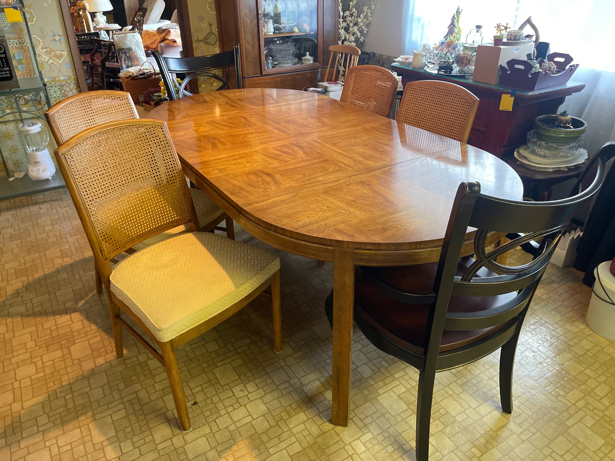 Drexel dining table featuring a parquet-style top and two extension leaves. Includes four matching cane-back chairs with upholstered seats and two complementary darker wood chairs. The set shows some wear consistent with use, including scuffs and scratches on the wood surfaces and minor staining on the chair cushions.