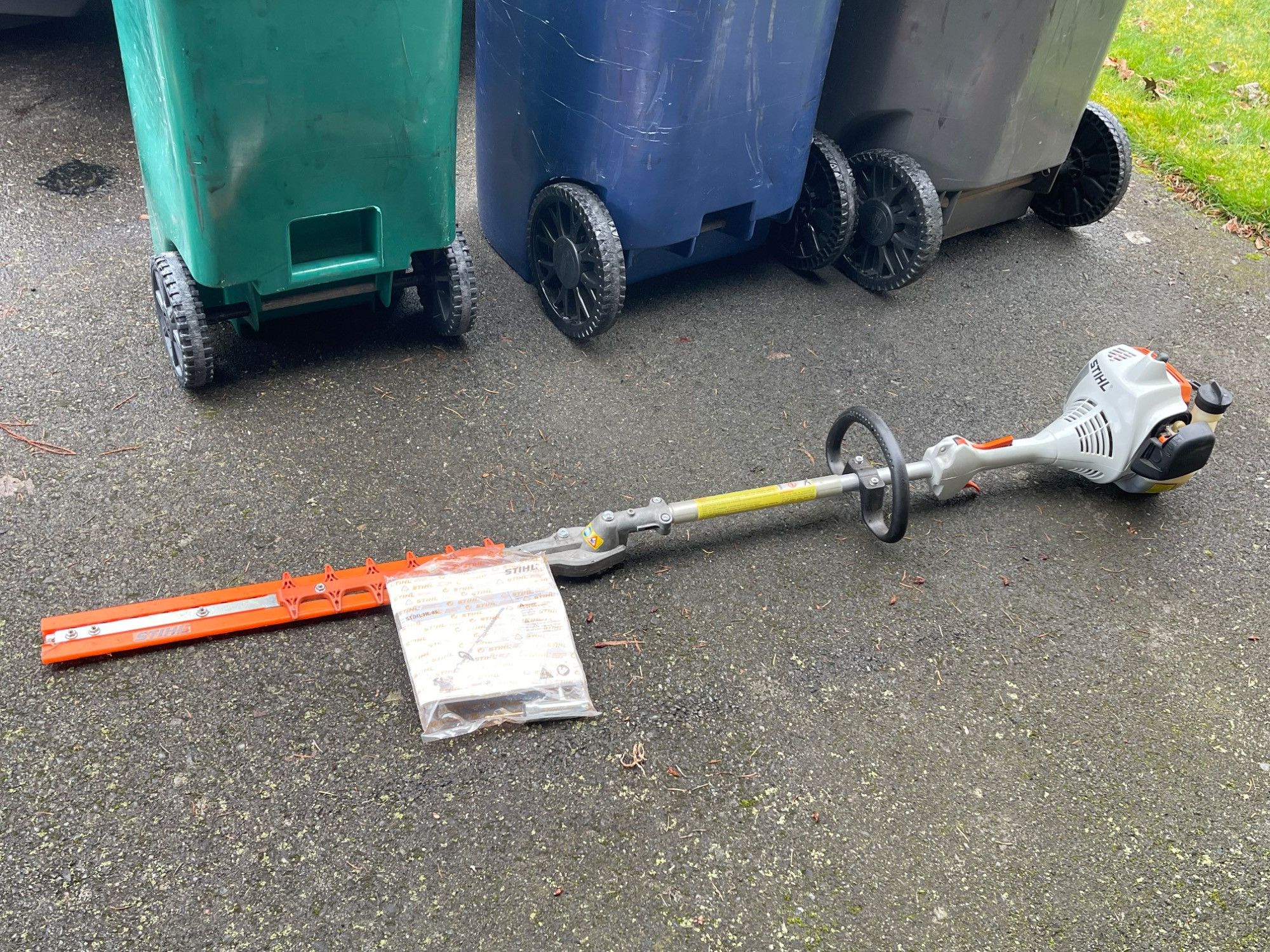Gas-powered Stihl HL 45 hedge trimmer with extended reach, ideal for trimming tall hedges and hard-to-reach areas. Includes protective blade cover and original instruction manual.