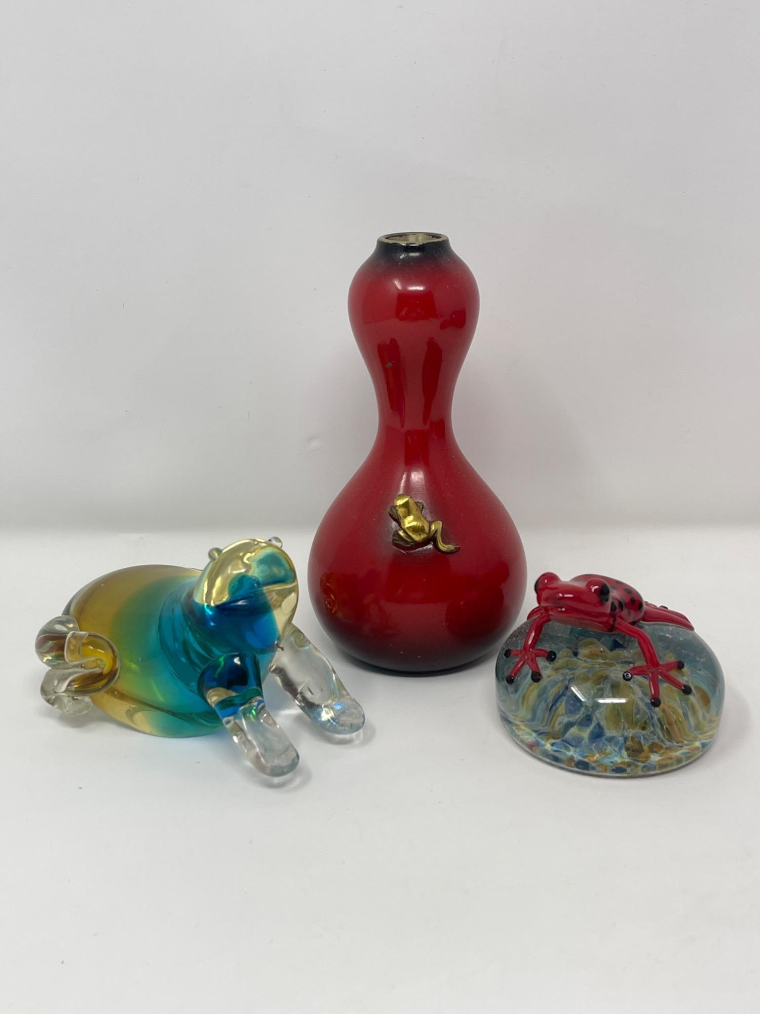 Grouping of three decorative tabletop accents including a red double-gourd cloisonné-style metal vase with applied gold-tone frog, a hand-fused Vinci glass seal figure by Dynasty Gallery in blue and amber tones, and a glass dome frog paperweight with internal swirl design.