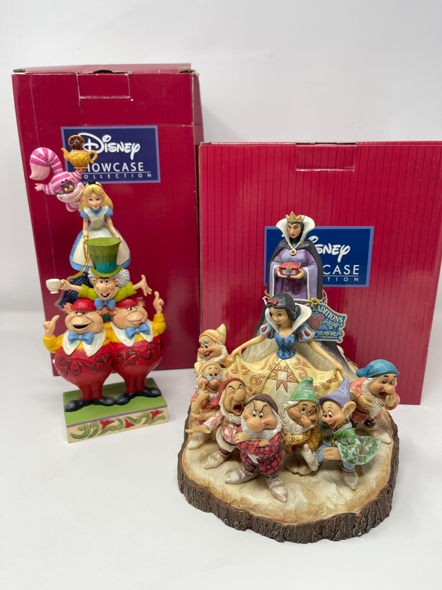Pair of Jim Shore Disney Traditions figurines produced by Enesco, LLC for the Disney Showcase Collection. "The One That Started Them All" features Snow White surrounded by all seven dwarfs and the Evil Queen. "We're All Mad Here" features Alice atop the Mad Hatter, Tweedledee and Tweedledum, with the Cheshire Cat perched above. Includes original boxes and certificates.