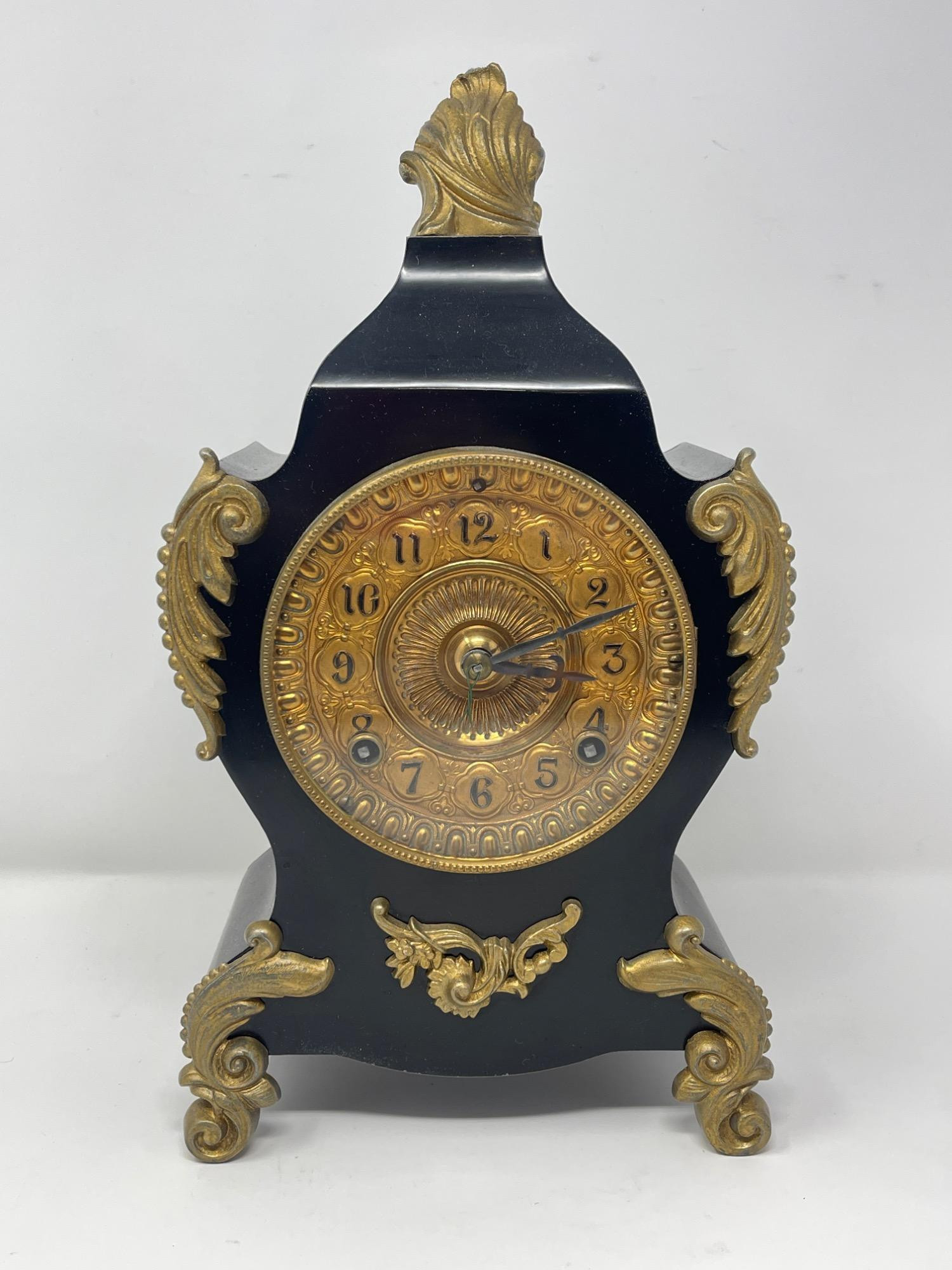 Ansonia “Calais Louis XIV” Cast Iron Mantel Clock – Circa 1895 Antique enameled cast iron mantel clock by Ansonia Clock Co., model “Calais Louis XIV,” featured in their 1894 catalog. This elegant piece showcases French-inspired detailing with gilded flourishes, a raised brass dial, and American sash. The cast iron body is painted black with ornate scrolled accents and sits on four stylized feet. A beautiful example of late 19th-century American clockmaking. Measurements: Approx. 15.25" H x 7.25" W (from catalog)