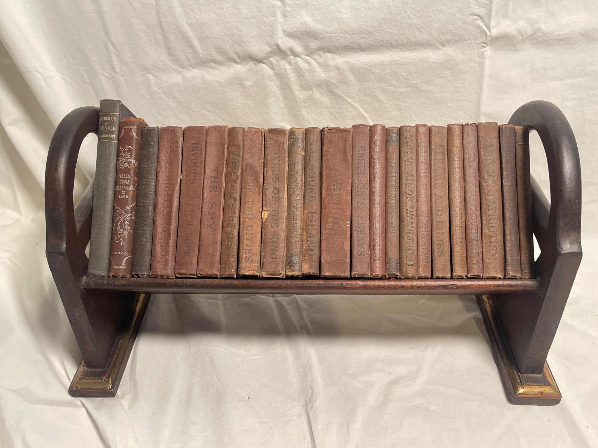 Charming collection of antique books displayed in a dark stained wooden cradle with curved end handles and painted foot accents. The books span classic literature and poetry, including titles such as Ivanhoe (1920), Treasure Island, Tales from Shakespeare, and Merchant of Venice. Many are part of early 20th-century series including Macmillan’s Pocket Classics and Academy Classics. Covers are clothbound in muted tones with embossed or gilt titles. Condition:
