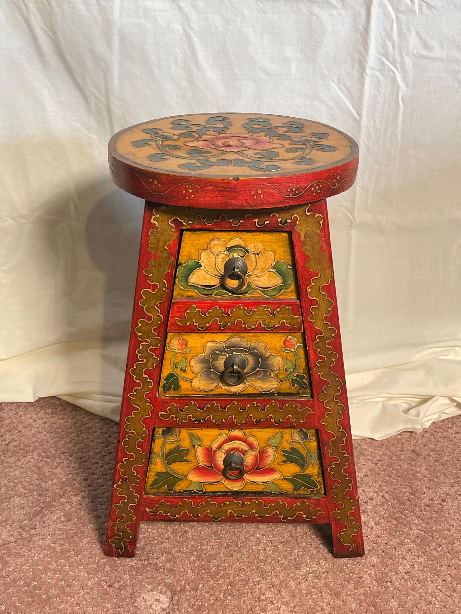 Colorful vintage wooden stool featuring a round top and three small drawers with carved ring pulls. Hand-painted floral motifs in vibrant red, yellow, green, and blue tones decorate the top and drawer fronts. Compact and eye-catching, this piece offers both decorative charm and functional storage. Condition: Scuffs, dents and scratches are present from continuous use. Stool remains sturdy.