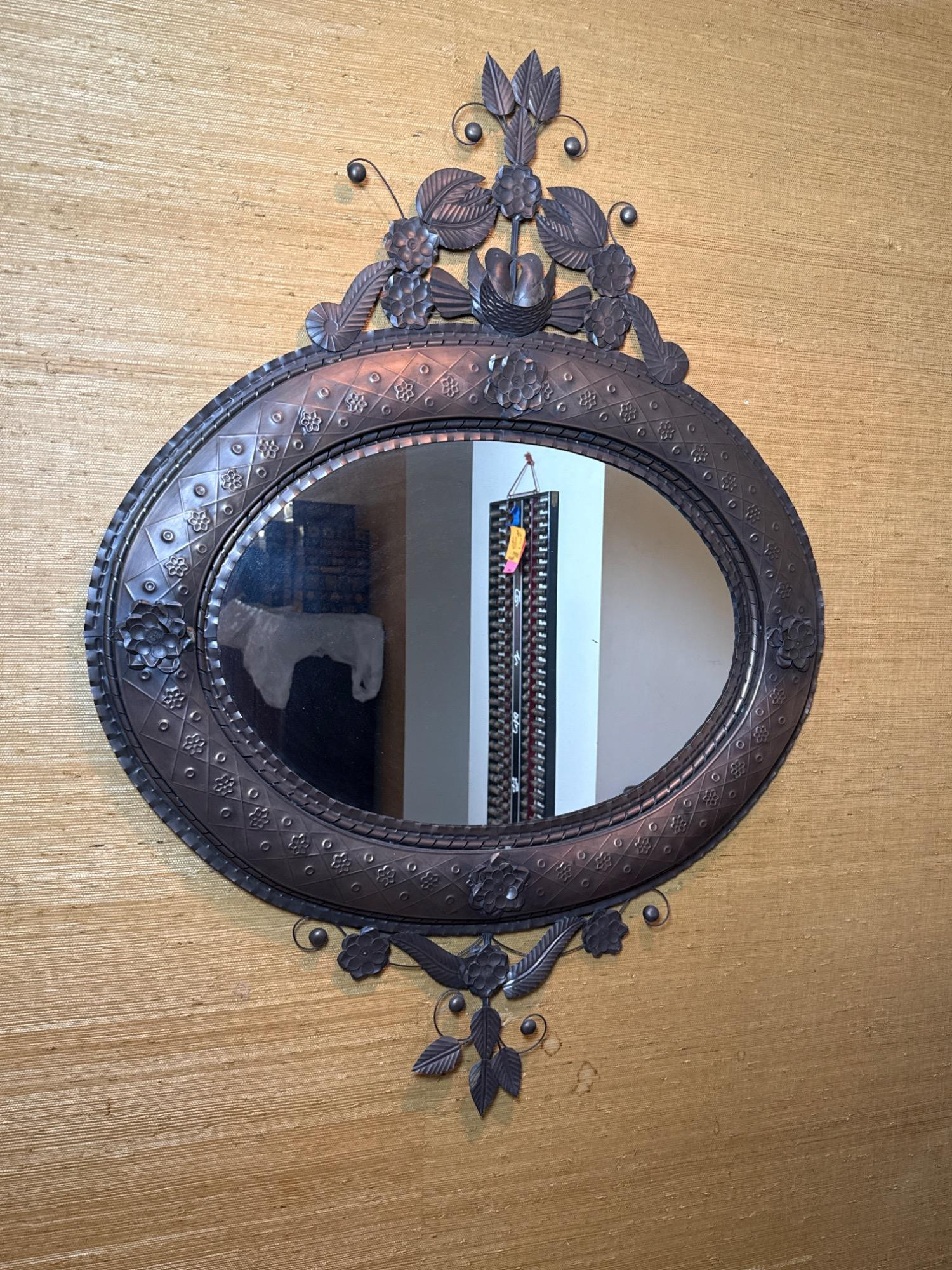 Lot # 73 - Vintage Embossed Oval Tin Mirror with Floral & Nest Motif