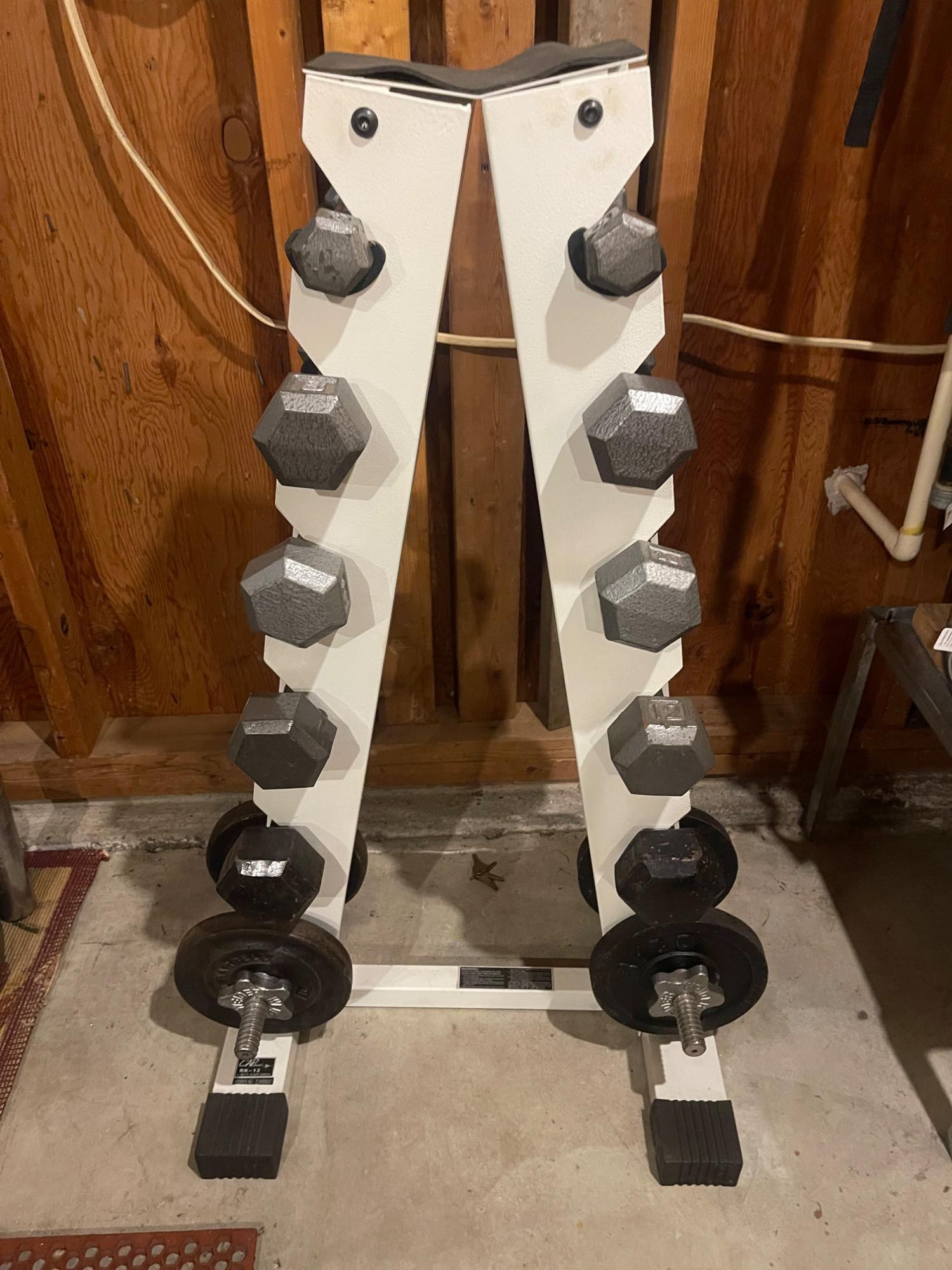 Complete dumbbell set, plus two adjustable spinlock dumbbells with additional plates. Includes sturdy vertical A-frame rack with rubber foot grips for stability and compact storage. Great for home gym setups.