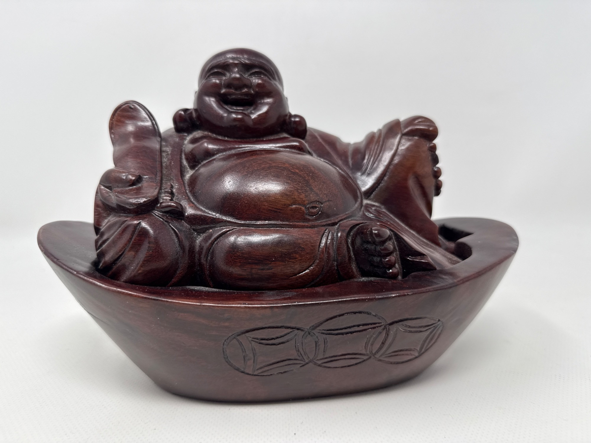 Hand-carved wood incense holder featuring a joyful Laughing Buddha seated atop a money boat, a traditional Chinese symbol of wealth and prosperity. The open center is designed to hold incense or small offerings, with detailed carving along the sides. Condition: Light surface wear.