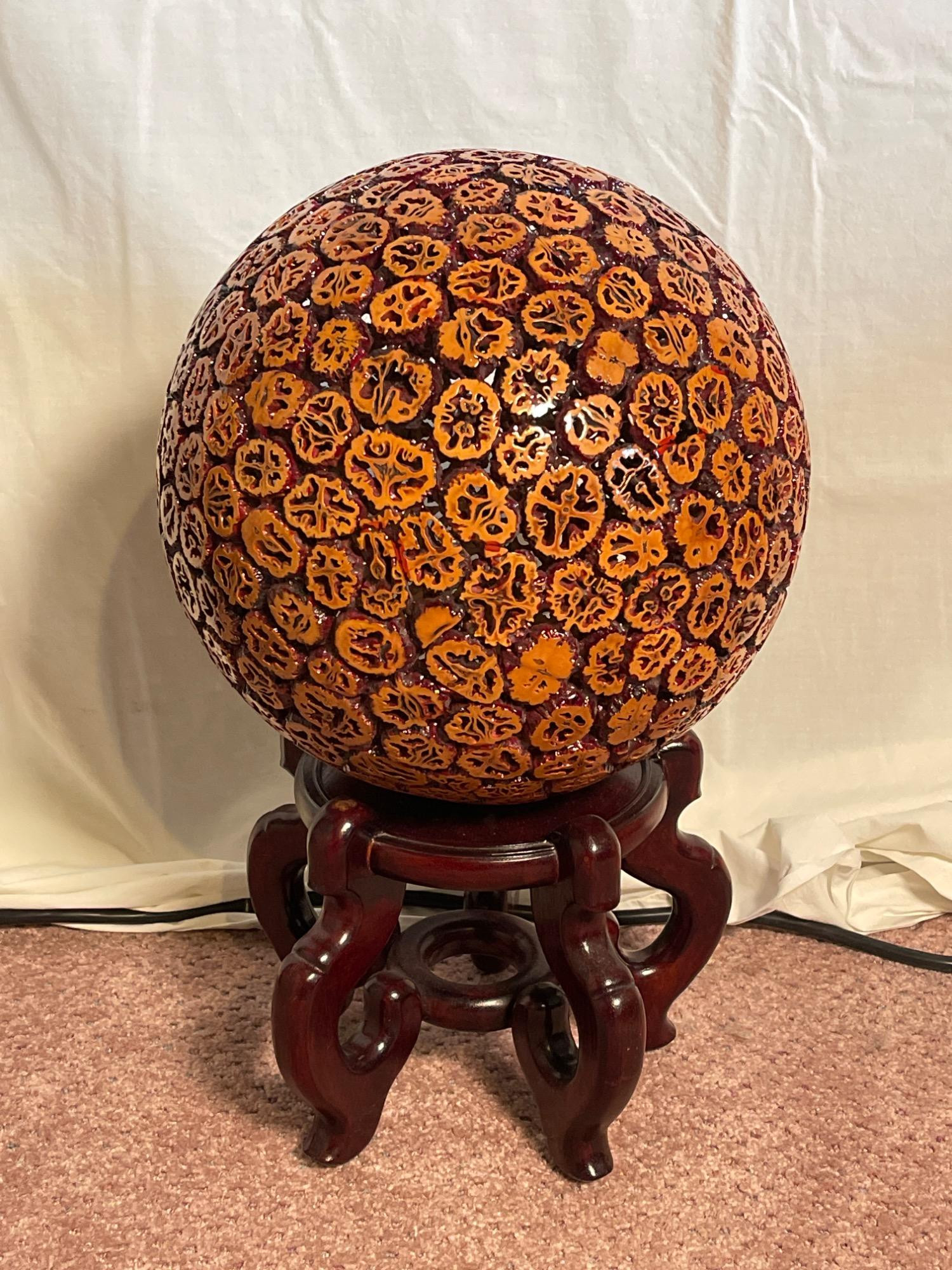 Decorative Lacquered Sphere with Stand Large decorative sphere composed of uniformly sliced organic material, possibly walnut shells or a similar botanical element, arranged in a dense mosaic pattern and finished with a high-gloss lacquer. The rich, earthy tones are contrasted by vibrant red highlights between the slices. Comes with a carved wooden display stand.