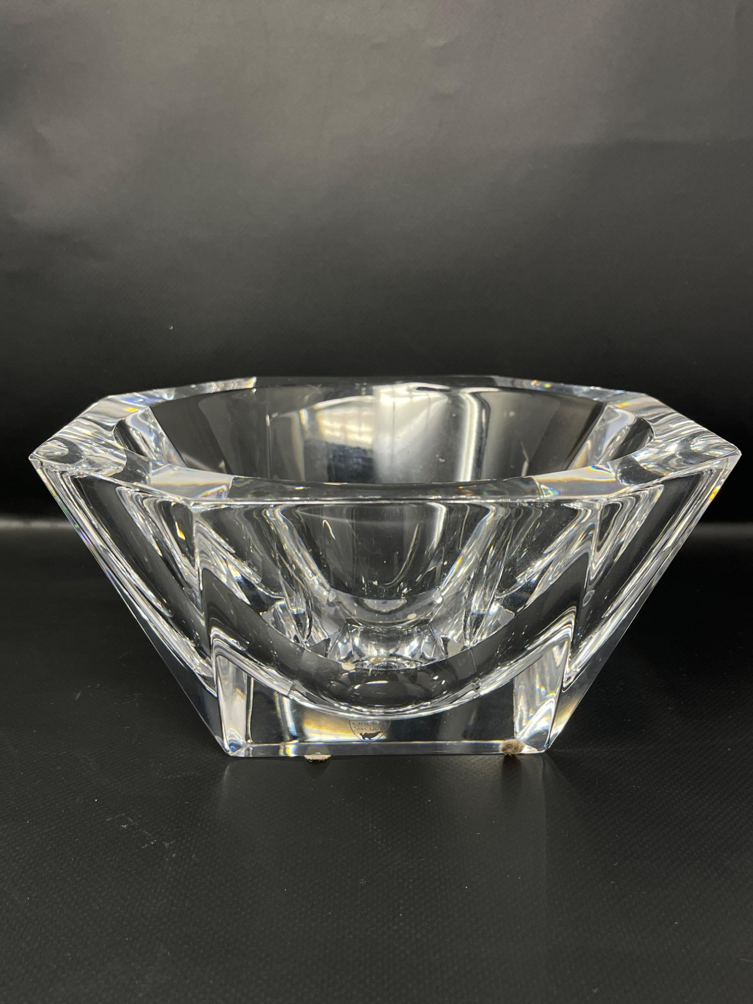 Elegant Orrefors crystal bowl featuring a sleek, angular silhouette with thick, faceted walls and a clear, polished finish. A striking example of Scandinavian design, ideal as a centerpiece or decorative accent. Condition: Minimal signs of wear; no visible chips or cracks