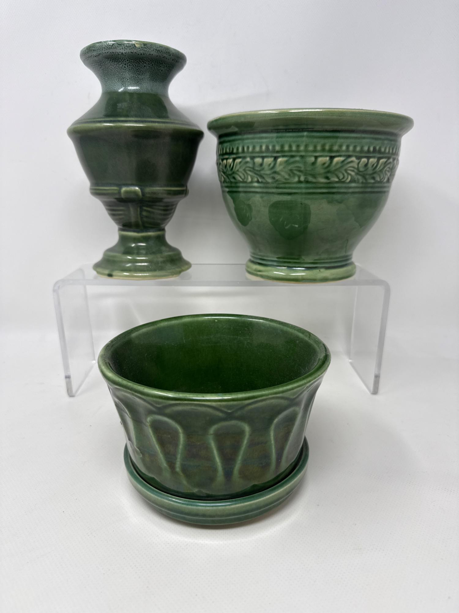 McCoy Vase, Hunt Pot, and Floraline Planter – Assorted Green Pottery