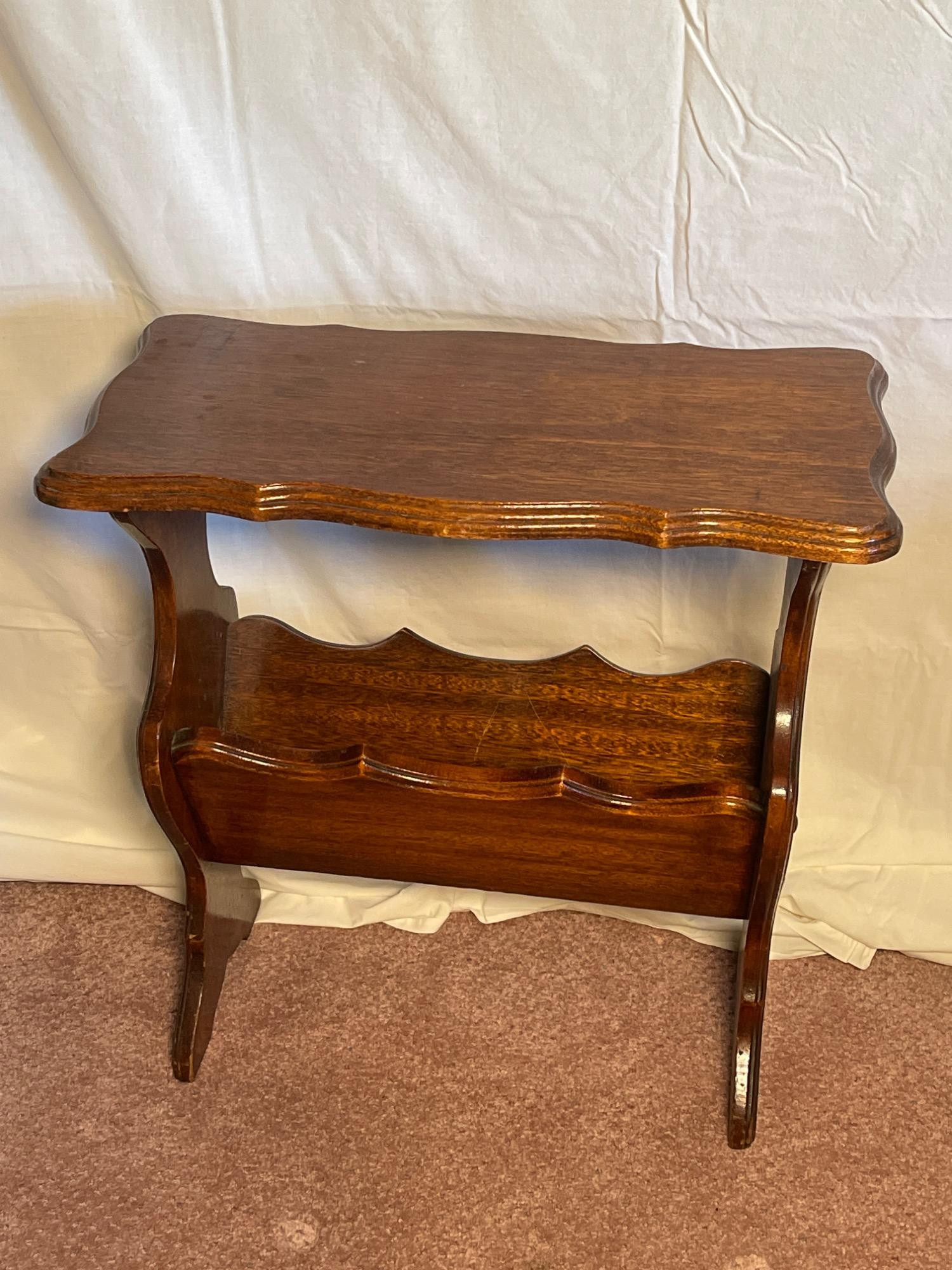 Classic vintage wooden table with a shapely scalloped-edge top and built-in lower magazine or book rack. Features curved legs and decorative carved details that blend both function and charm. Condition: Some scratches and wear to finish consistent with age