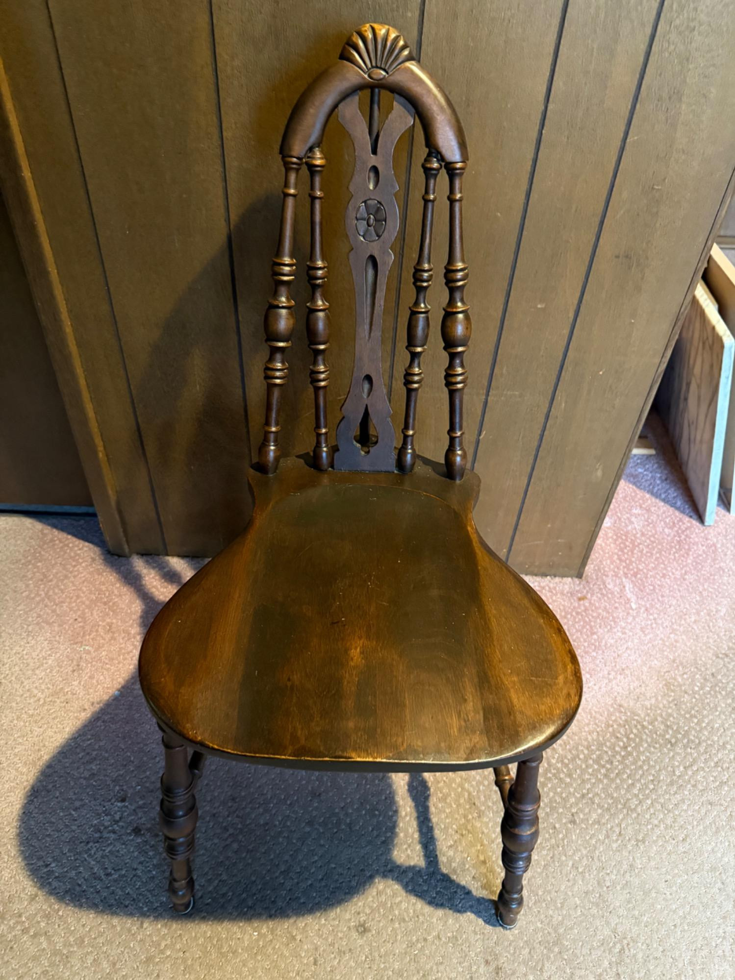 This charming wooden chair features classic Windsor-style design with turned spindles and legs, and a shapely saddle seat. A carved shell crest and floral medallion add a touch of decorative elegance to the backrest. Solid and sturdy, this piece blends function with traditional form. Condition: Minor surface wear and some uneven finish to seat. Scuffs and scratches from use are present.