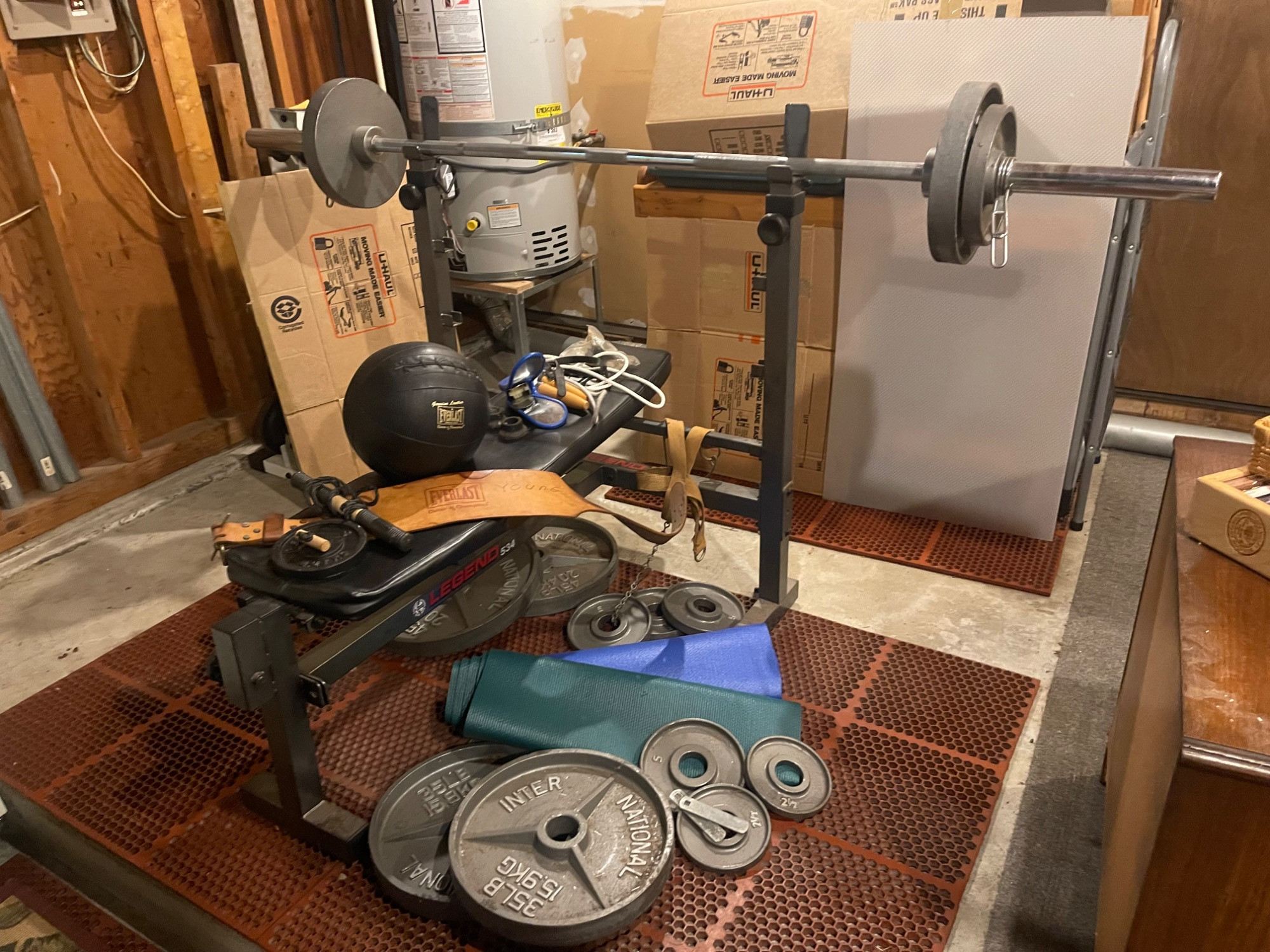 Heavy-duty Legend Fitness 3-way adjustable bench paired with a barbell and a variety of weight plates. Includes Everlast leather lifting belt, medicine ball, resistance bands, and additional workout accessories. Condition: Moderate wear consistent with use; plates and bar show cosmetic scuffing