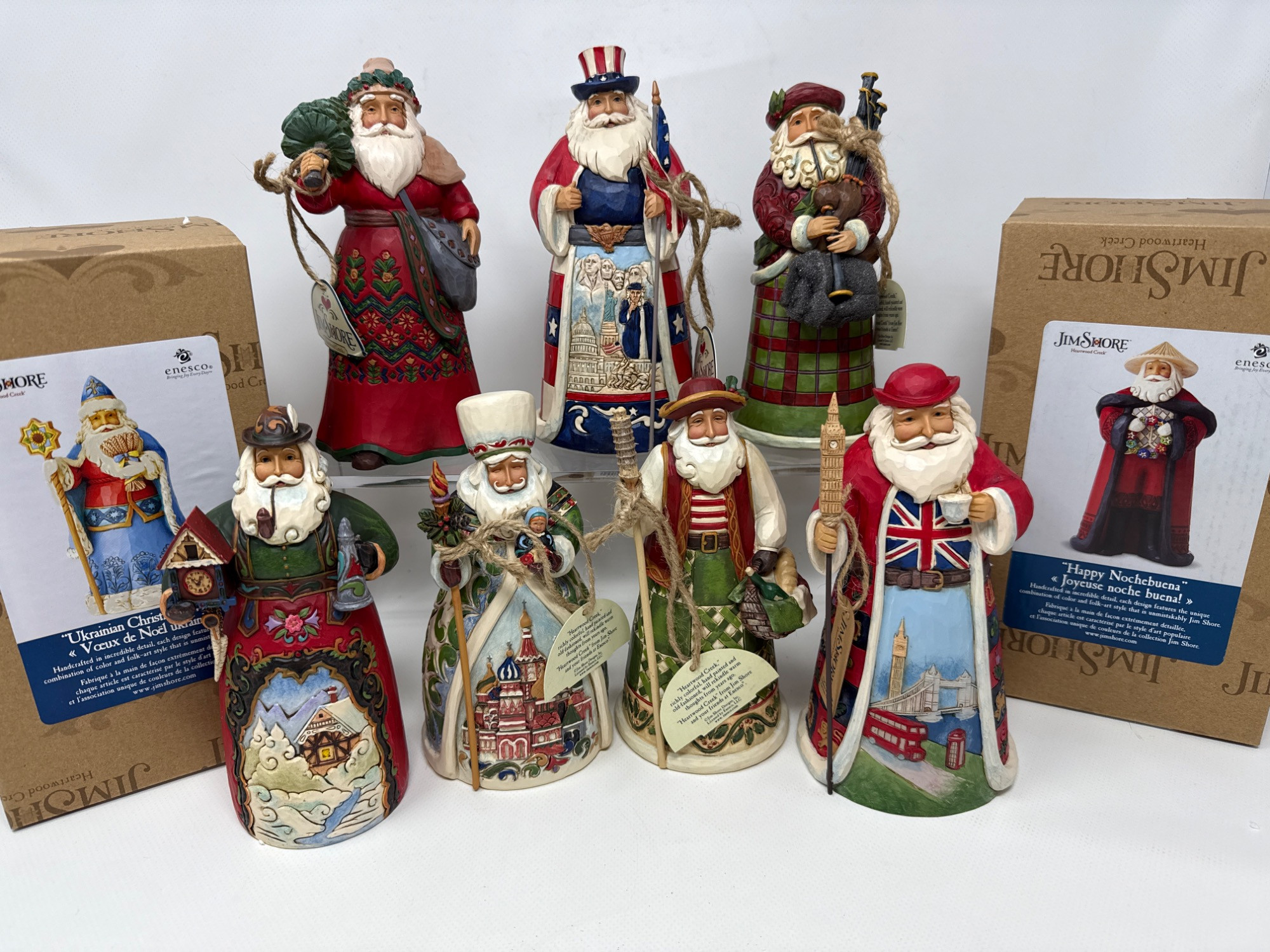 Jim Shore Heartwood Creek “Global Collection” Santas Assortment of Jim Shore Heartwood Creek Santas, each representing a different country or cultural theme. Hand-painted resin with folk art details and regional motifs. Condition: Excellent overall