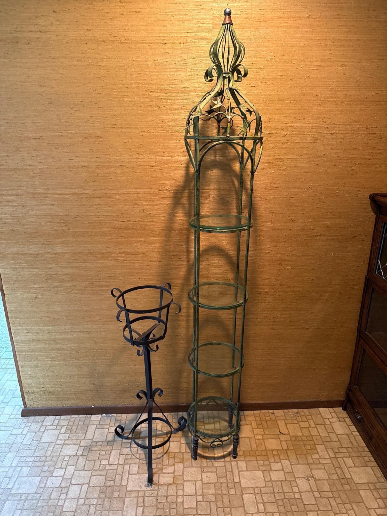 Tall green wrought iron display shelf with copper-toned accents, leaf motif, and four round glass shelves. Topped with a decorative spire and finished in a patinated green tone. Paired with a black wrought iron plant stand featuring scrolled legs and an open ring support.