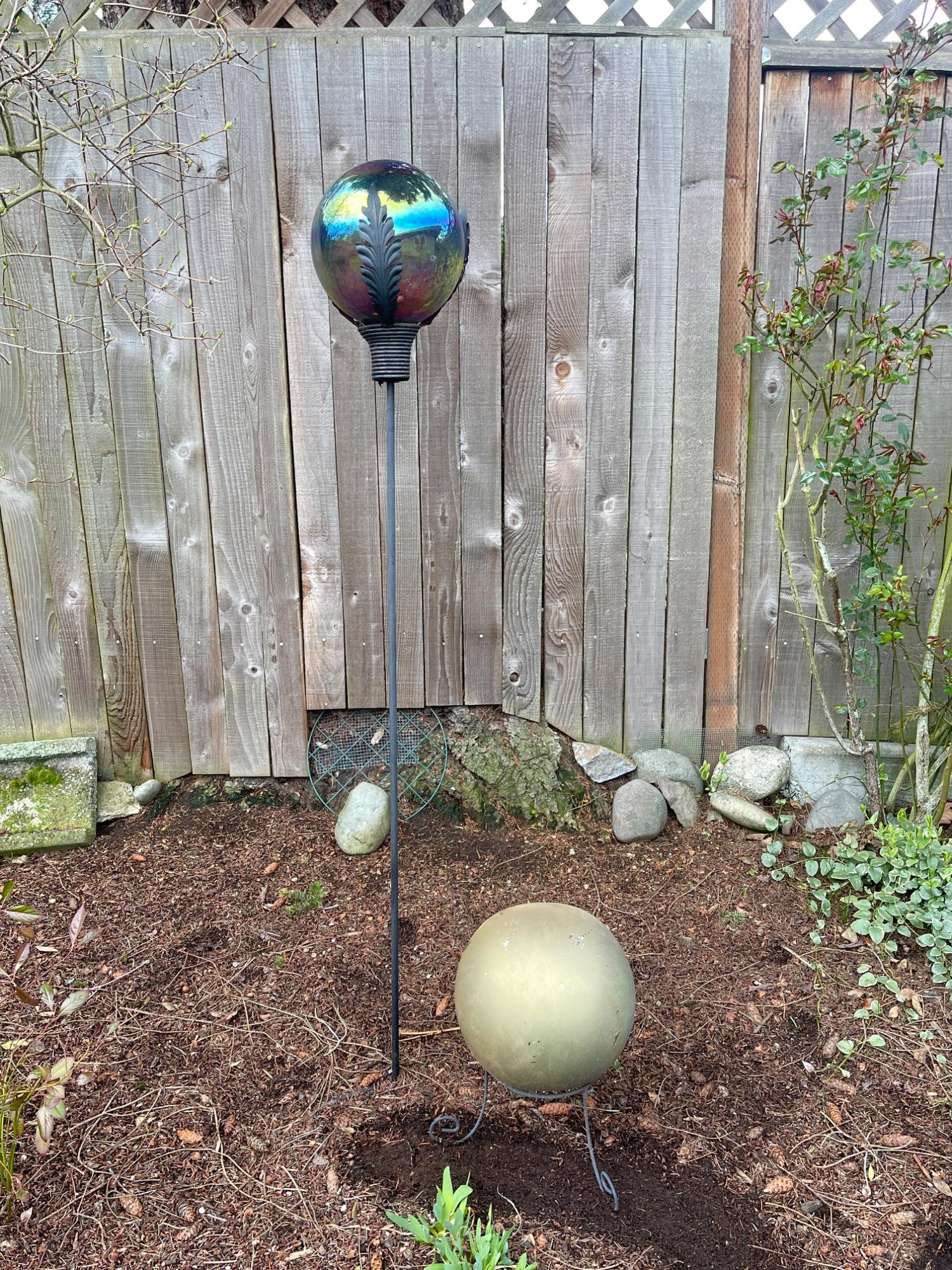 Lot # 118 - Pair of Decorative Garden Balls with Stands –Iridescent & Matte Finish