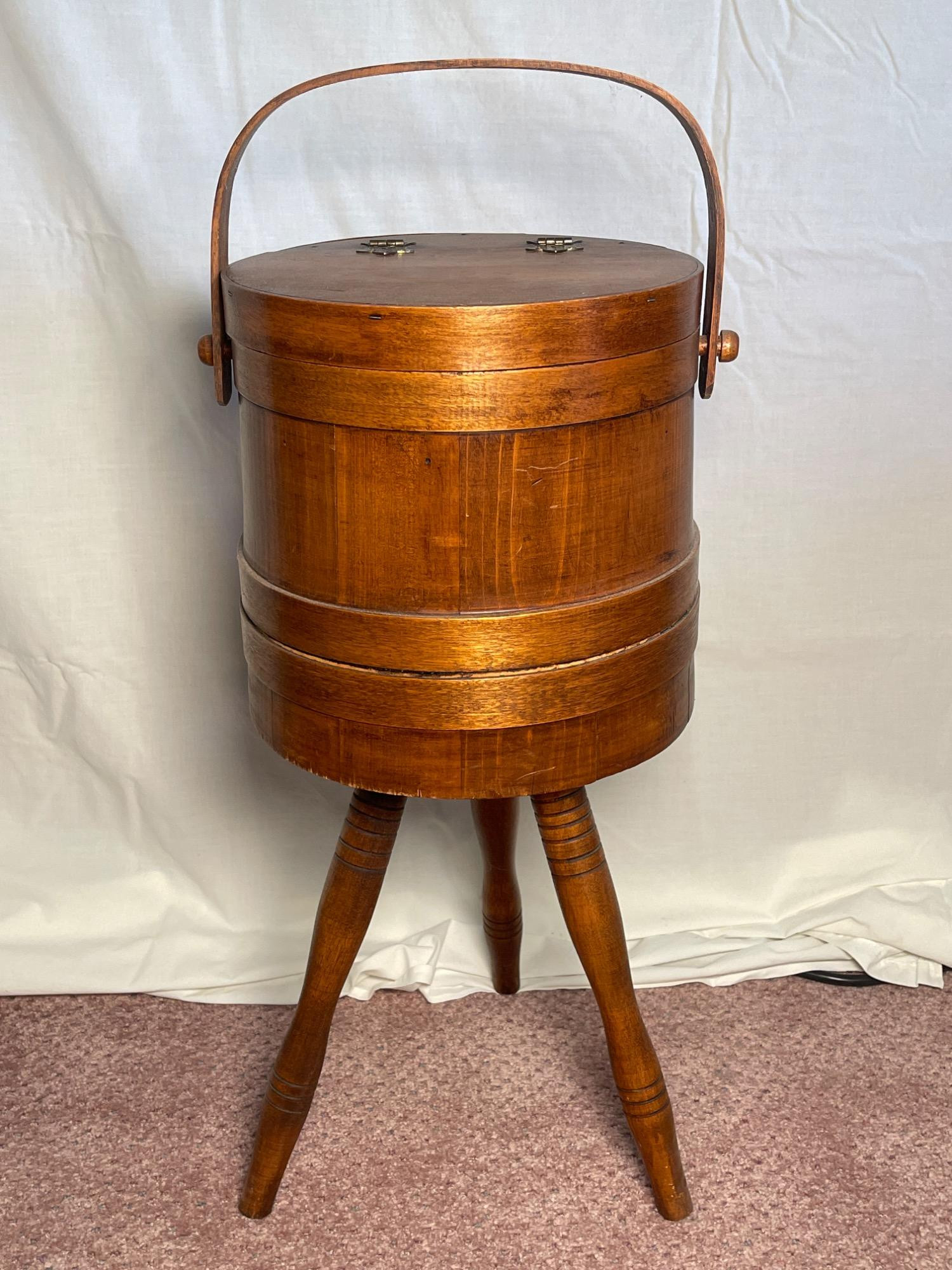 Vintage Wooden Sewing Basket on Legs Charming vintage sewing basket crafted from warm-toned wood, raised on three turned legs. The cylindrical basket features a hinged lid with twin metal hinges and a slender wood handle attached at each side. The form resembles a firkin but opens at the top, revealing interior storage for sewing notions or craft supplies. A decorative and functional accent piece.